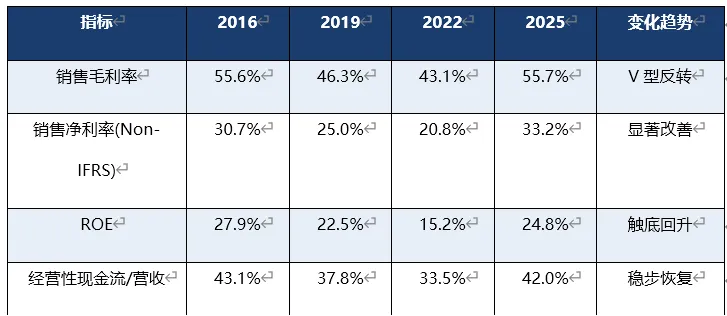 毛利率V型反转:从2016年的55.6%降至2022年低点43.1%,再回升至2025年的55.7%,反映业务结构优化和经营杠杆释放;