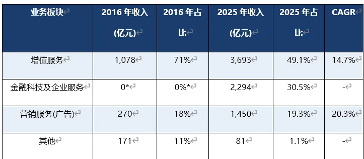 十年间最显著的变化:腾讯从「游戏一家独大」变为「三引擎驱动」。增值服务占比从71%降至49%,金融科技从零长成3,000亿级业务,营销服务受益视频号和AI实现加速增长。