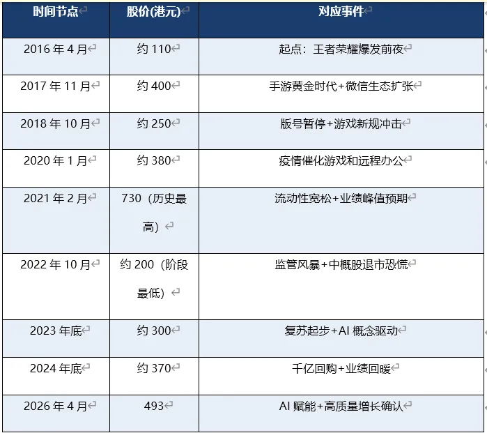 十年涨幅:从110港元到493港元,累计涨幅约347%,年化收益率约16%。但期间波动剧烈,从2021年730港元到2022年200港元,最大回撤超70%。