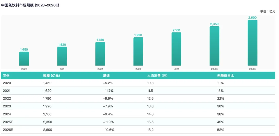 2020-2025年,中国茶饮料市场规模从1450亿元增长至2350亿元,CAGR约10%。2021年增速11.7%为峰值,受益于疫情后健康意识觉醒叠加无糖茶爆发;2024-2025年恢复双位数增长(9-12%),无糖茶渗透率持续提升为核心驱动因素。预计2026年市场规模达2600亿元,2028年有望突破3000亿元。
