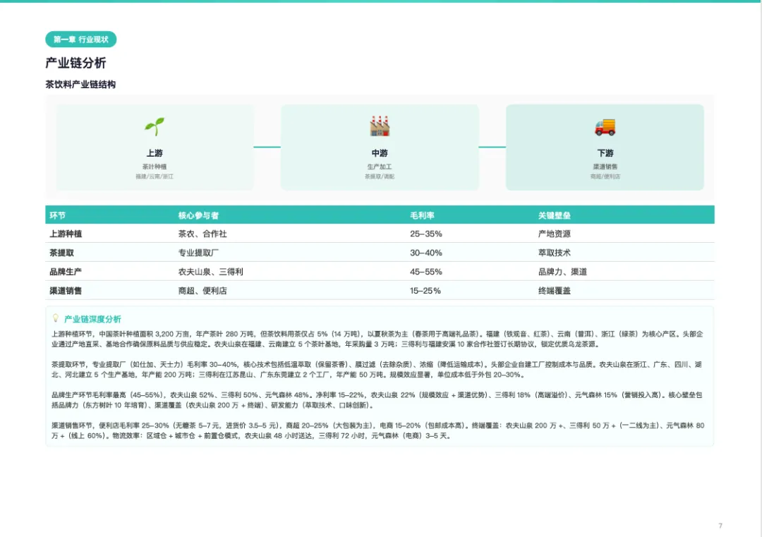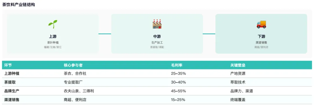 上游种植环节毛利率25-35%,茶提取环节30-40%,品牌生产环节毛利率高达45-55%(农夫山泉52%、三得利50%),渠道销售环节15-25%。核心壁垒包括:品牌力(东方树叶10年培育)、渠道覆盖(农夫山泉200万+终端)、研发能力(萃取技术、口味创新)。