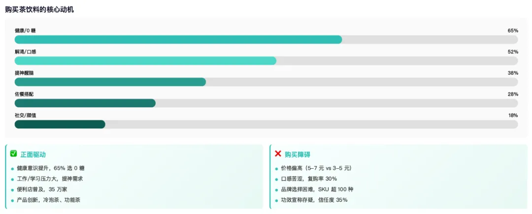 购买障碍方面,价格偏高(无糖茶5-7元 vs 含糖茶3-5元,溢价50-100%)为最大障碍,下沉市场接受度低。口感苦涩导致初次尝试者复购率仅30%(老用户60%)。市场SKU超100种,消费者选择困难。