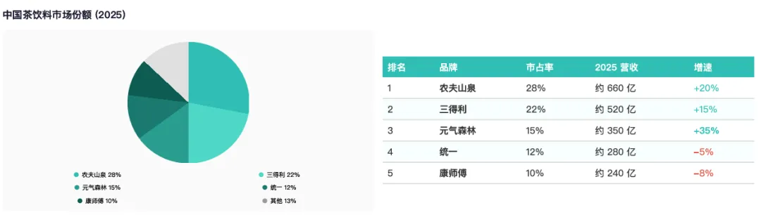 无糖茶CR3=65%,集中度显著高于整体市场:农夫山泉35%、三得利20%、元气森林10%。反映头部品牌在无糖茶领域的先发优势和品牌壁垒。国产品牌崛起,市占从2020年25%提升至2025年55%。