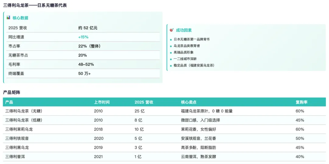 三得利2025年营收约52亿元,同比+15%,无糖茶市占20%。成功因素包括日本无糖茶第一品牌背书、乌龙茶品类教育者、高端品质形象、一二线城市深耕。复购率60%(行业平均45%)。