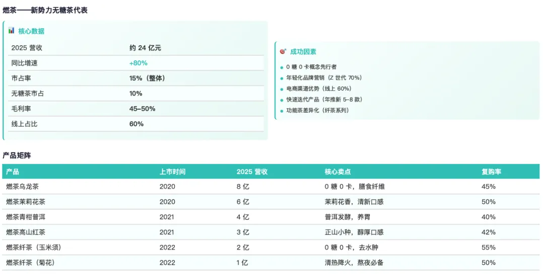 元气森林2025年营收约24亿元,同比+80%,无糖茶市占10%。成功因素包括0糖0卡概念先行者、年轻化品牌营销(Z世代70%)、电商渠道优势(线上60%)、功能茶差异化(纤茶系列)。2020-2022年投入营销15亿元,快速建立品牌认知。