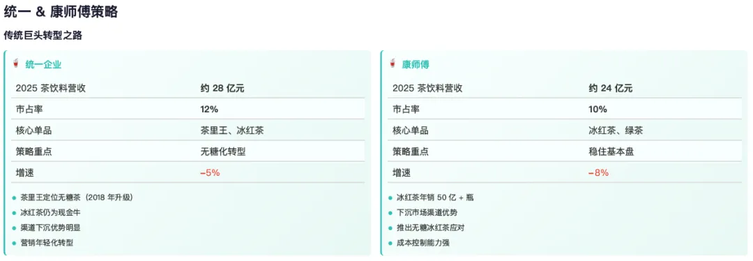 统一和康师傅面临无糖茶冲击,含糖茶基本盘持续下滑(-5%)。统一冰红茶2020-2025年营收从35亿元降至28亿元,康师傅冰红茶从40亿元降至24亿元。统一通过茶里王积极转型无糖茶,康师傅推出无糖冰红茶应对。两者渠道优势明显(下沉市场县乡覆盖率80%+),但品牌形象老化,Z世代接受度低。