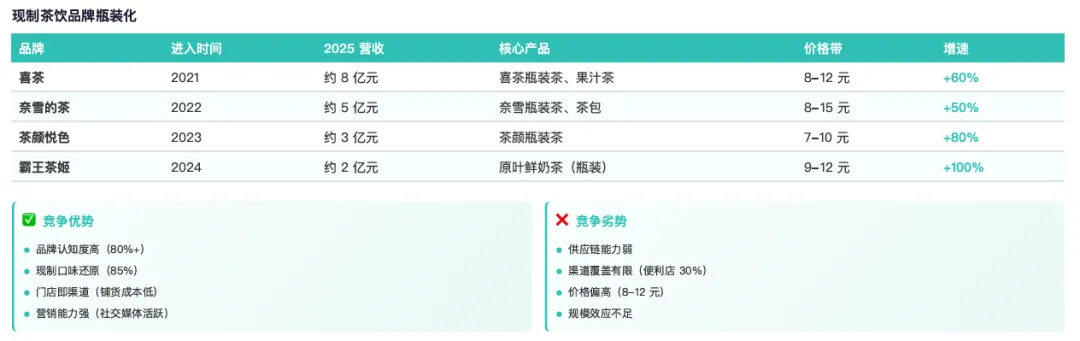喜茶、奈雪、茶颜悦色、霸王茶姬等现制茶饮品牌推出瓶装茶,2025年合计营收18亿元,占比5%。定位高端(8-12元),差异化竞争。竞争优势包括品牌认知度高(80%+)、现制口味还原(85%)、门店即渠道。竞争劣势包括供应链能力弱、渠道覆盖有限、规模效应不足。