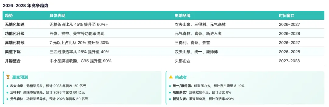 无糖化、功能化、高端化、渠道下沉四大趋势驱动行业持续整合。头部企业受益(合规成本低、规模效应),中小品牌受损(成本上升、退出加速)。预计2028年CR5达90%,CR10达95%。农夫山泉、三得利、元气森林有望持续领跑。