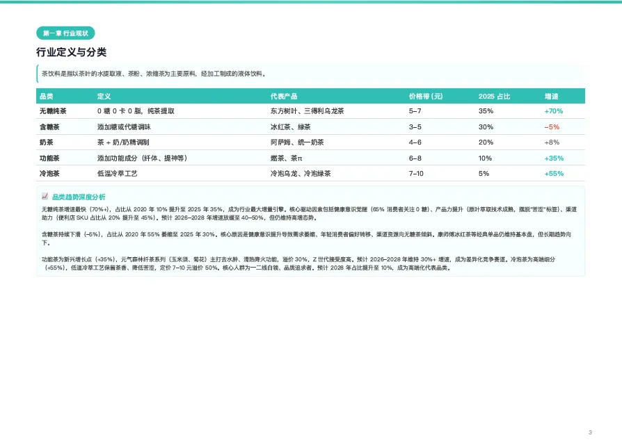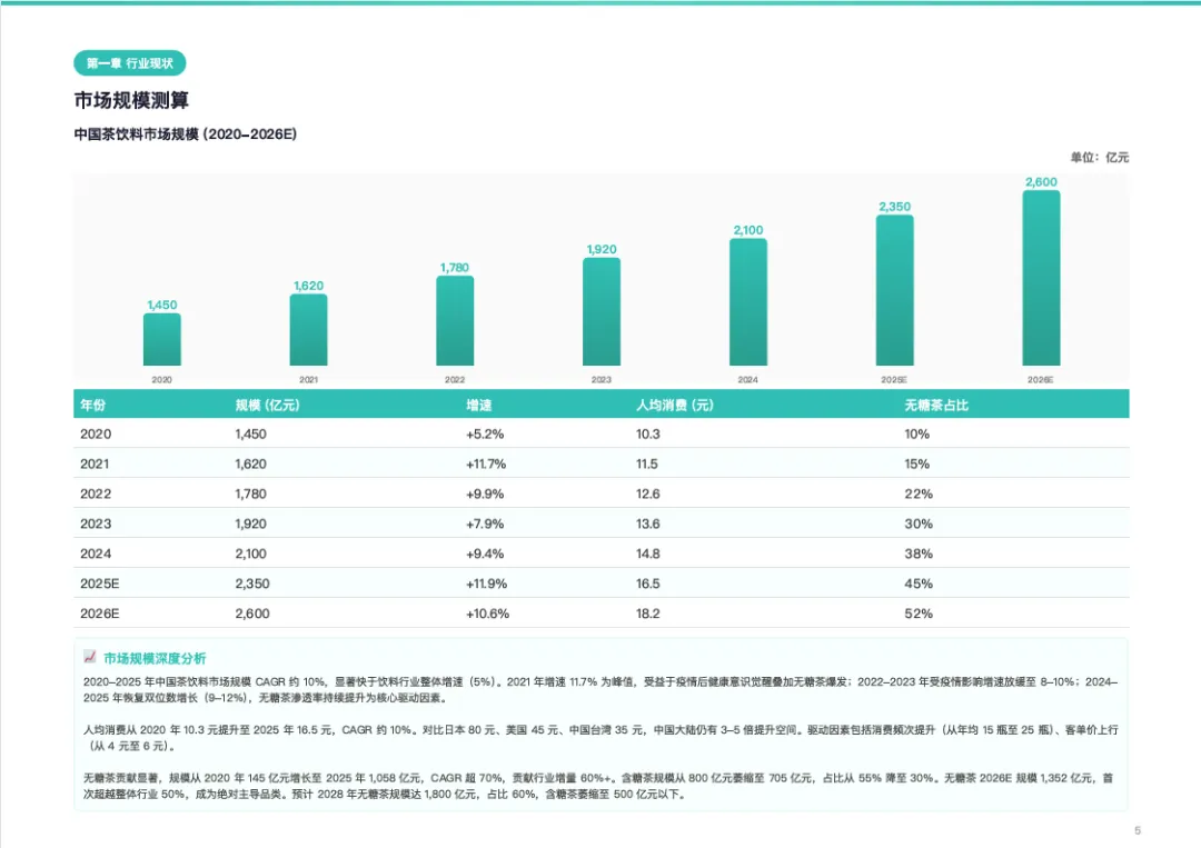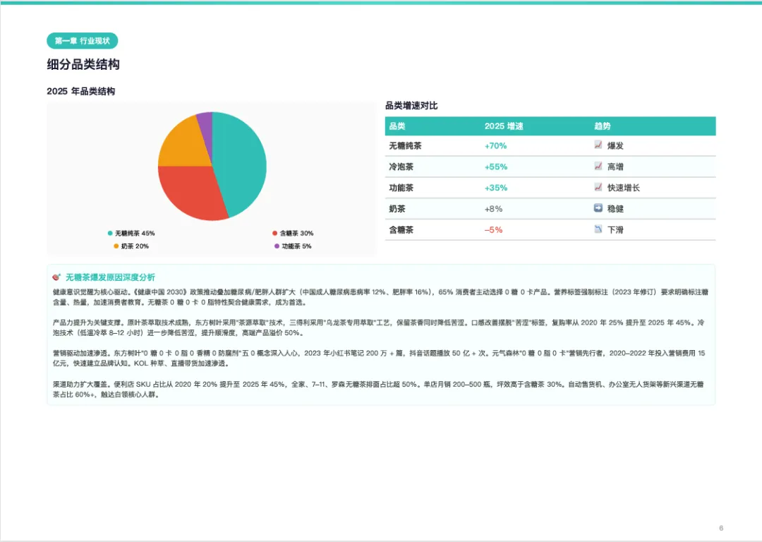 这些数字勾勒出中国茶饮料行业的真实图景:无糖茶已从边缘品类成长为行业核心引擎,健康化浪潮正在重塑从产品、渠道到竞争格局的全链条。