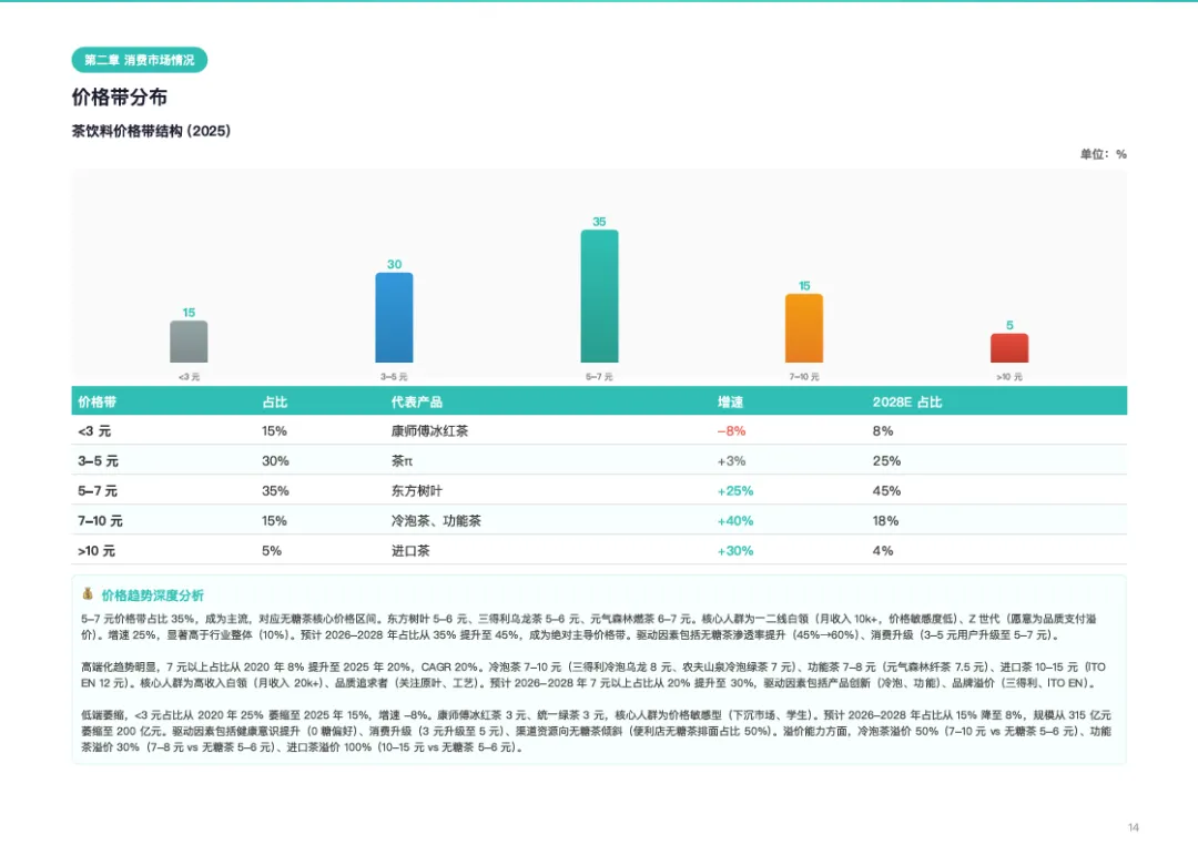 冷泡茶(+55%)、功能茶(+35%)、进口茶(+30%)驱动高端化。一二线接受度高(70%),Z世代愿意为品质支付溢价(65%)。预计2028年7元以上规模900亿元,占比30%。