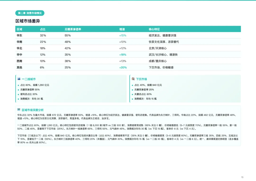 一二线城市占比60%,便利店密集,无糖茶渗透率高(一线55% vs 三线25%),消费频次年均30瓶(vs 三线15瓶),客单价6元(vs 三线4元)。下沉市场增速快(+25%),为未来增量。