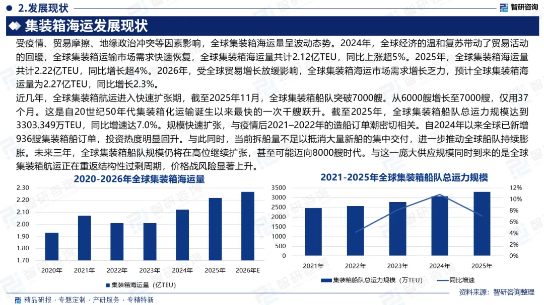 远洋集装箱航运连接不同国家和地区的港口,航线覆盖全球主要贸易通道,如亚欧航线、跨太平洋航线、跨大西洋航线等,涉及国际间的货物进出口运输。集装箱海运产业链上游涵盖集装箱制造、集装箱船舶制造、燃料及港口码头等配套设备等,其所提供的集装箱、船舶等核心装备,是实现集装箱海运业务的关键支撑。中游为航运公司,核心职能是完成集装箱的运输与中转。下游主要涵盖各类进出口贸易企业、制造业企业,需求分布与全球贸易格局、制造业布局高度相关。受疫情、贸易摩擦、地缘政治冲突等因素影响,全球集装箱海运量呈波动态势。2024年,全球经济的温和复苏带动了贸易活动的回暖,全球集装箱运输市场需求快速恢复,全球集装箱海运量共计2.12亿TEU,同比上涨超5%。2025年,全球集装箱海运量共计2.22亿TEU,同比增长超4%。2026年,受全球贸易增长放缓影响,全球集装箱海运市场需求增长乏力,预计全球集装箱海运量为2.27亿TEU,同比增长2.3%。2025年全球海运航线货量走势分化明显。受美国关税政策调整影响,太平洋航线货量同比下降4.6%;南北航线则受益于非洲、南美等区域进口贸易快速增长,货量增幅达7.5%;亚欧航线及亚洲区域内航线在中国进出口贸易支撑下,海运量保持增长,增速分别为4.1%和4.9%。近几年,全球集装箱航运进入快速扩张期,截至2025年11月,全球集装箱船队突破7000艘。从6000艘增长至7000艘,仅用37个月。这是自20世纪50年代集装箱化运输诞生以来最快的一次千艘跃升。截至2025年,全球集装箱船队总运力规模达到3303.349万TEU,同比增速达7.0%。截至2025年上半年,全球班轮公司运力排名依旧保持稳定,前几名头部公司变化均不明显,市场依旧被龙头企业垄断。其中地中海航运、马士基、达飞轮船、中远海运集团分别以671.9万TEU、458.9万TEU、401.9万TEU、342.0万TEU的运力位居第一、第二、第三、第四,运力占据着全球集装箱航运市场超57%的份额。未来,在供需矛盾突出的背景下,运价将继续承压回调。受此影响,集装箱运输企业的利润水平可能受到挤压,行业竞争随之加剧,进而可能引发新一轮的行业并购。