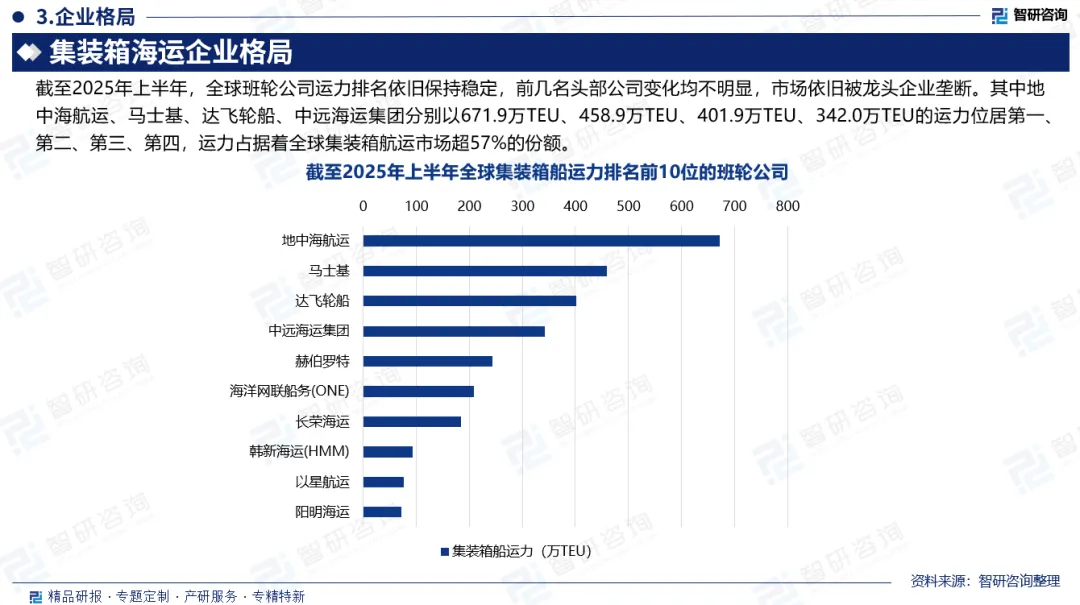 企业格局:截至2025年上半年,全球班轮公司运力排名依旧保持稳定,前几名头部公司变化均不明显,市场依旧被龙头企业垄断。其中地中海航运、马士基、达飞轮船、中远海运集团分别以671.9万TEU、458.9万TEU、401.9万TEU、342.0万TEU的运力位居第一、第二、第三、第四,运力占据着全球集装箱航运市场超57%的份额。
