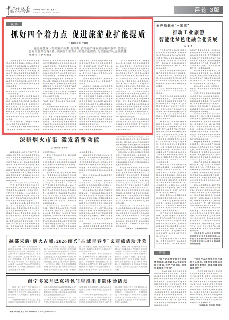 旅游业是服务业的重要组成部分,且以综合性、标准化和时尚性为特征,在标准化体系建设、品牌打造和消费场景创新等方面,发挥着先行和示范作用。在当前国家大力实施扩内需、促消费、拉动经济增长的战略体系中,旅游业应充分发挥自身优势,抓好四个着力点,实现扩能提质,为促进经济社会高质量发展作出更大贡献。