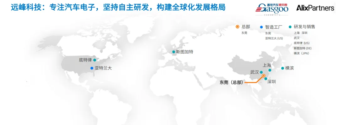 围绕智能进入、智能镜像、智能空间三大核心业务,远峰科技已搭建起全球化研产销一体化体系,在中国东莞、美国亚特兰大布局生产基地,并于美国底特律、德国斯图加特、日本横滨等地设立海外研发与营销中心,服务网络覆盖亚洲、欧洲、北美全球核心市场。