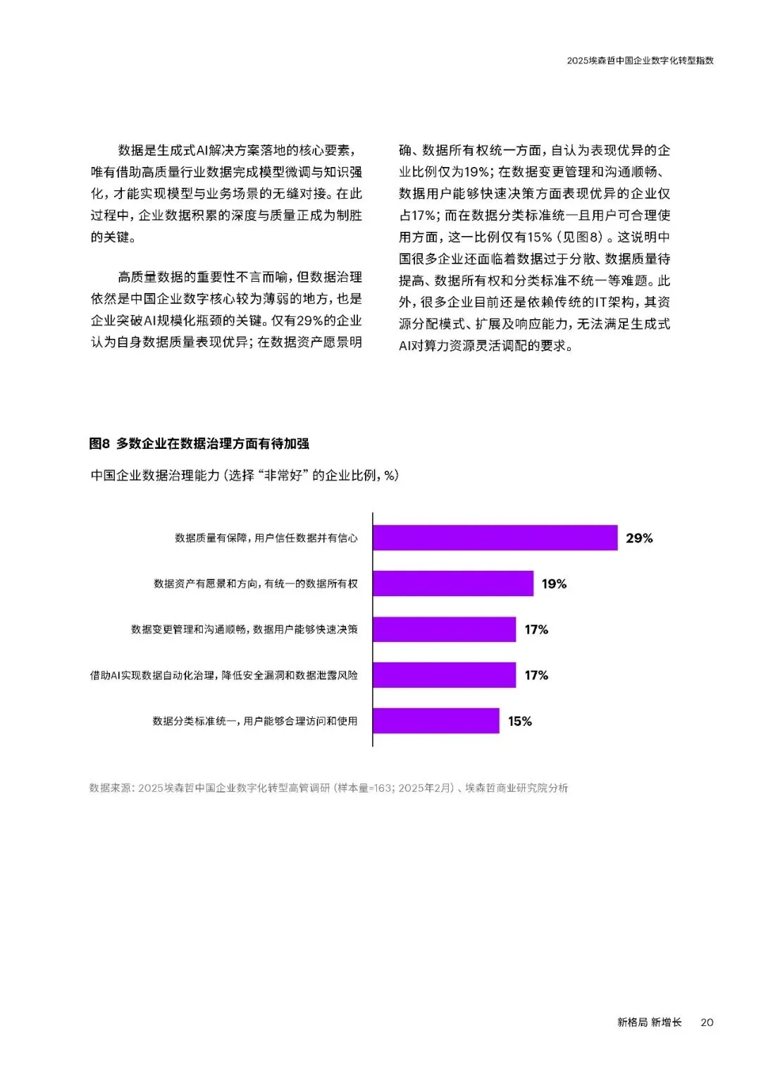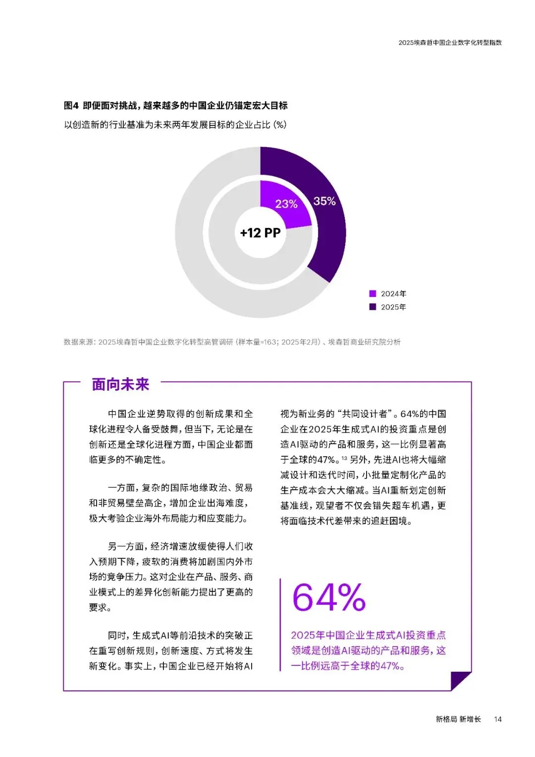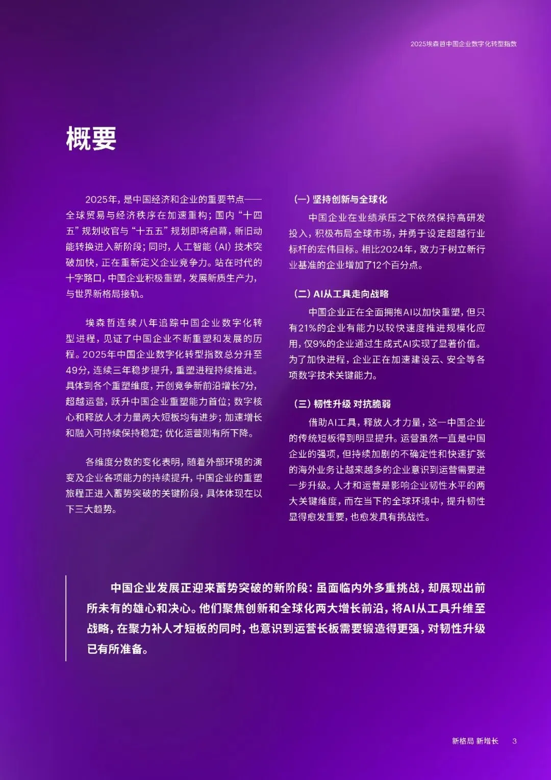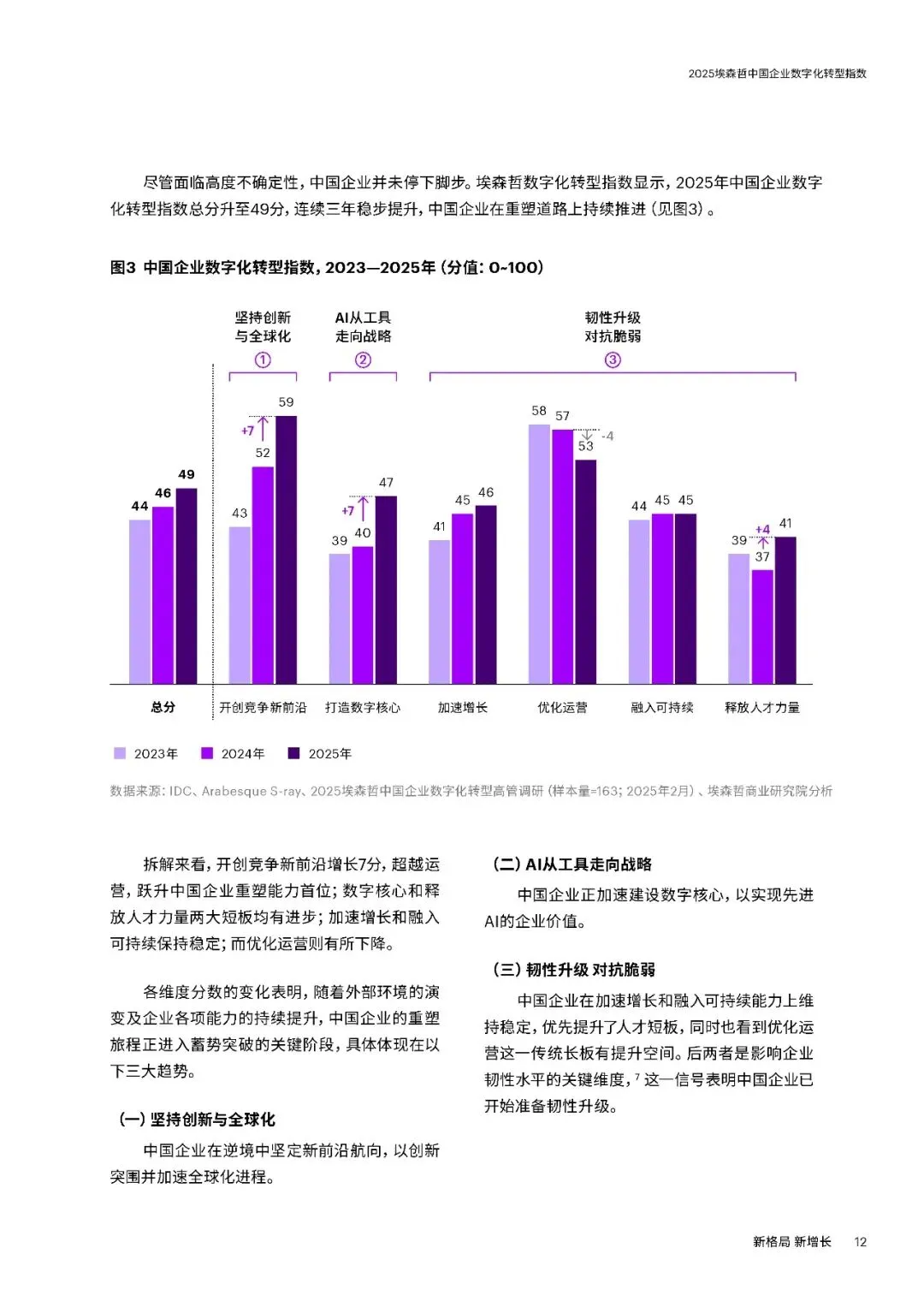 埃森哲连续八年追踪研究显示,2025年中国企业数字化转型指数升至49分,连续三年稳步提升,企业重塑呈现三大趋势,同时面临新挑战与机遇,需聚焦四大要务实现新增长。