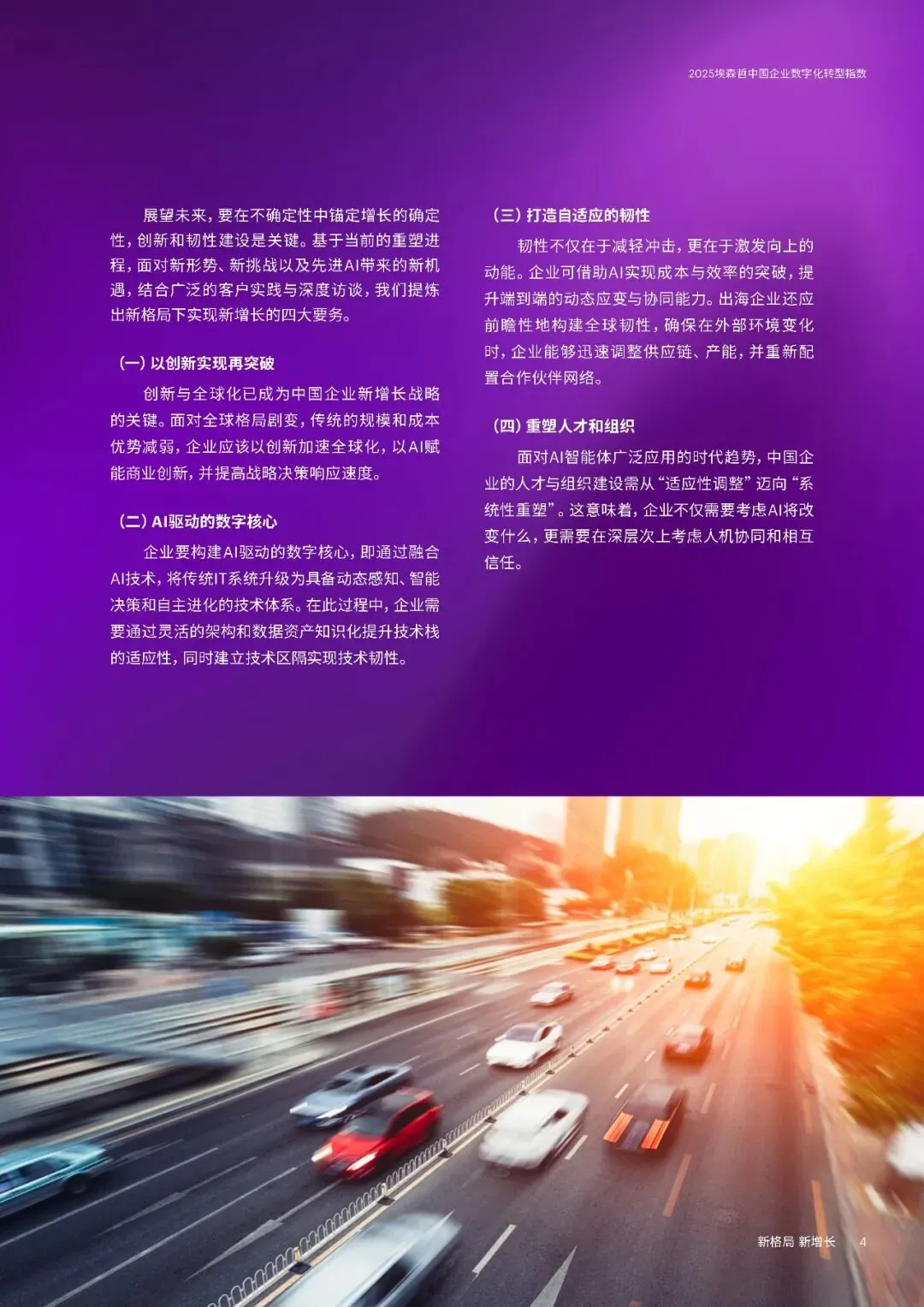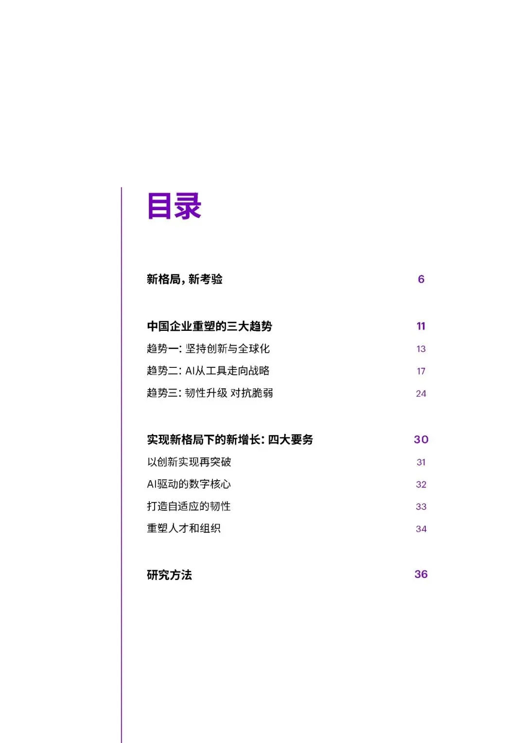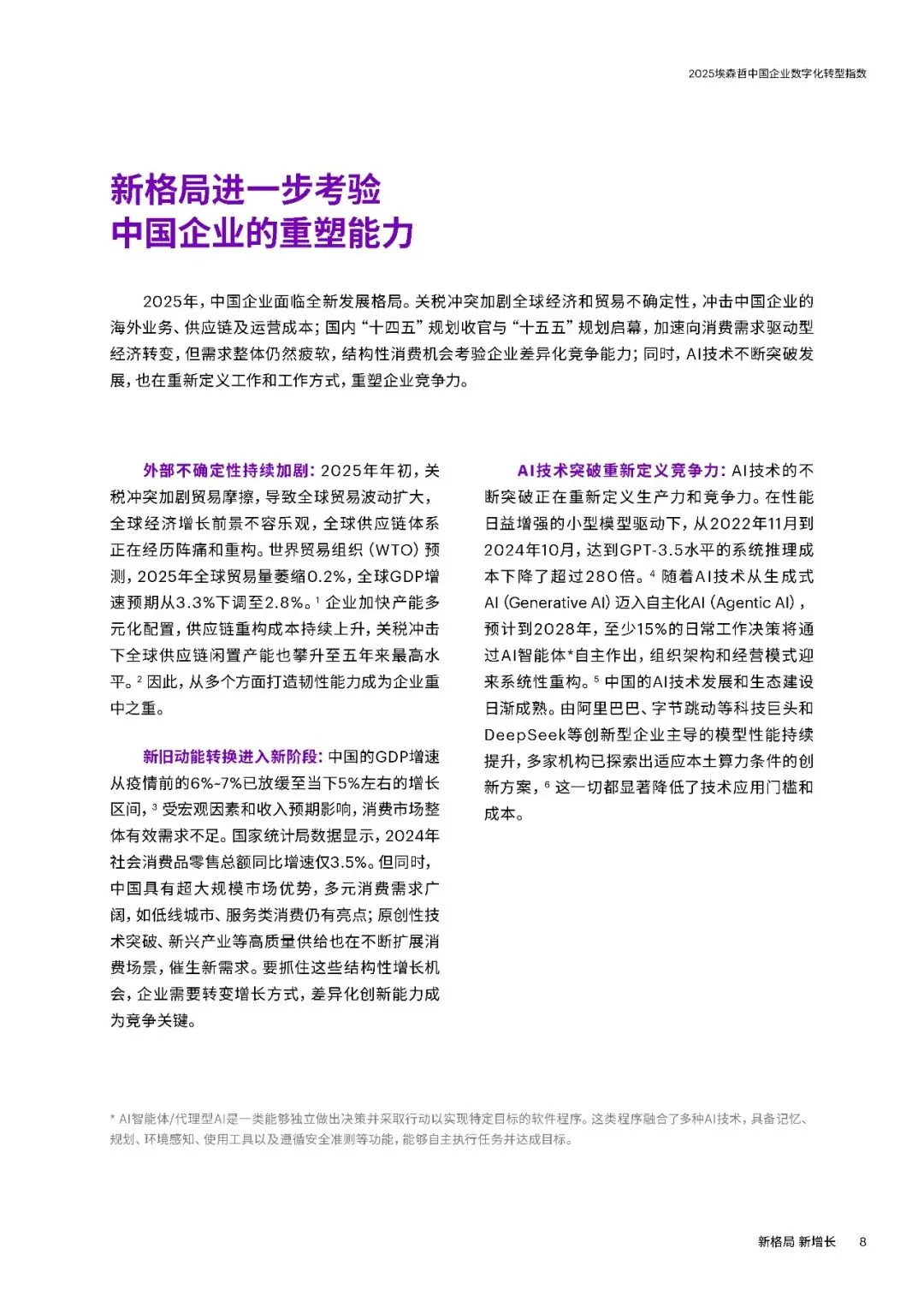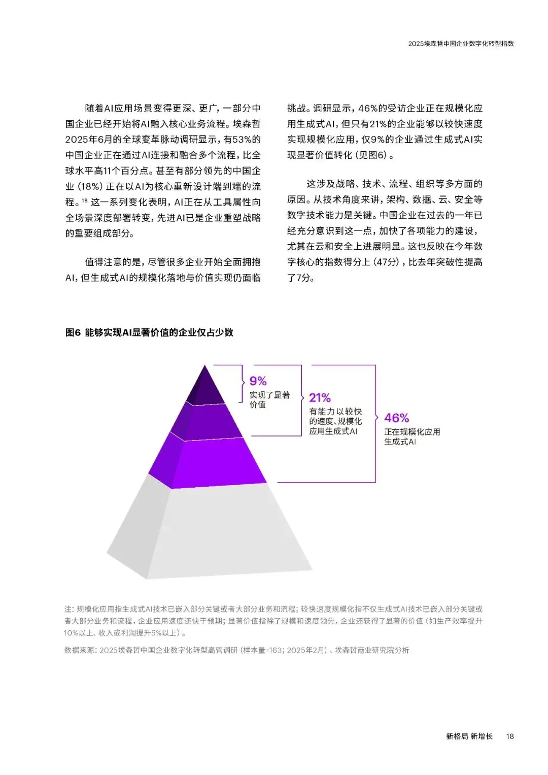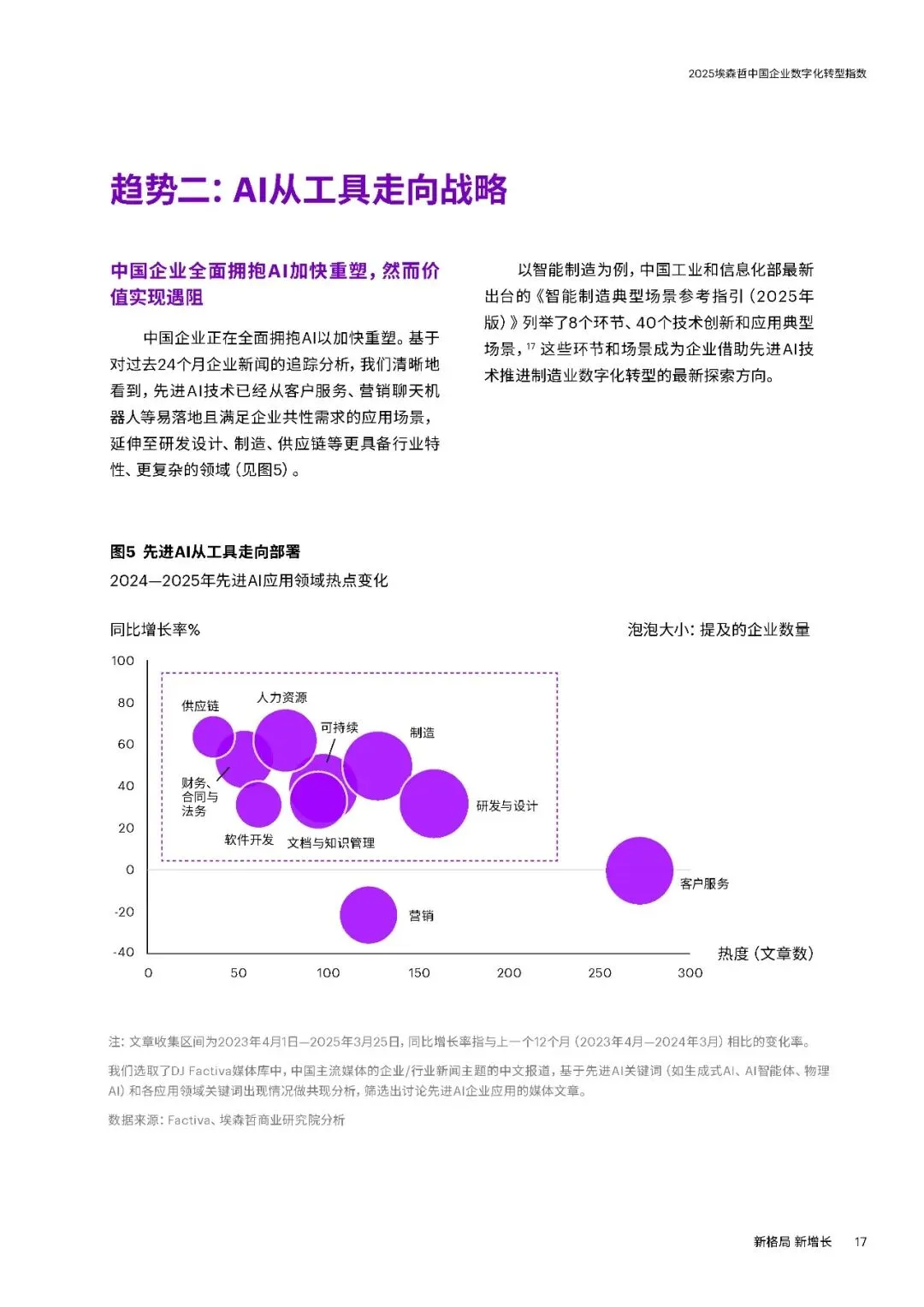 三大趋势方面,一是坚持创新与全球化。中国企业逆境中加大研发投入,2024年大型企业研发支出同比增长9%,远超收入增速。在高端制造、ICT、生物医药等领域成果显著,同时加速全球化,37%的大型企业2024年海外收入占比超五分之一,致力于从“产品出海”向“品牌与技术出海”转型。二是AI从工具走向战略。企业加速布局AI,应用场景向研发设计等复杂领域延伸,53%的中国企业通过AI连接融合多个流程。但仅9%的企业实现生成式AI显著价值转化,数字核心能力得分提升7分,云与安全建设进步明显,数据治理仍是短板。三是韧性升级对抗脆弱。“释放人才力量”得分上升4分,但组织系统性变革滞后,仅34%的企业重新设计组织架构适应AI。“优化运营”得分下降4分,静态韧性特征明显,供应链可视化和跨部门协同不足,出海企业供应链与合规能力薄弱。