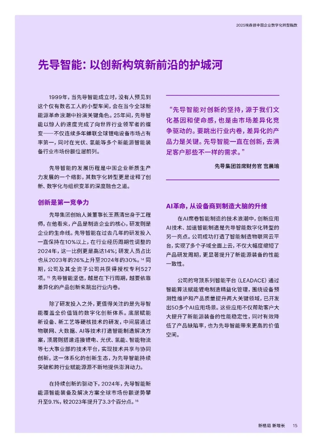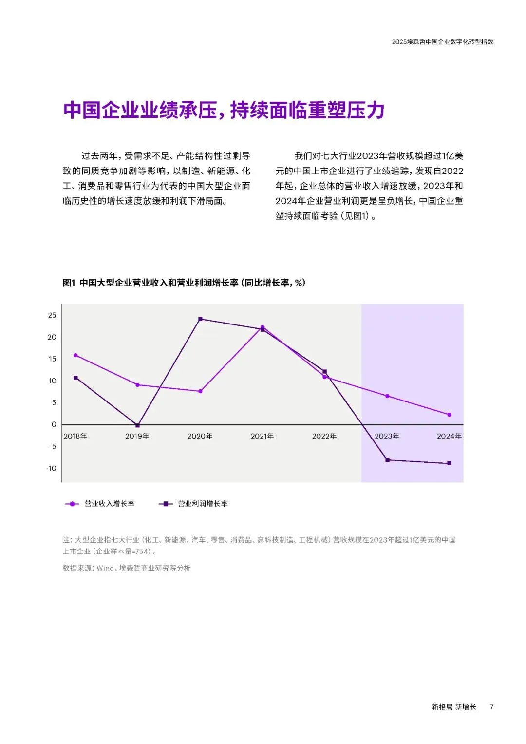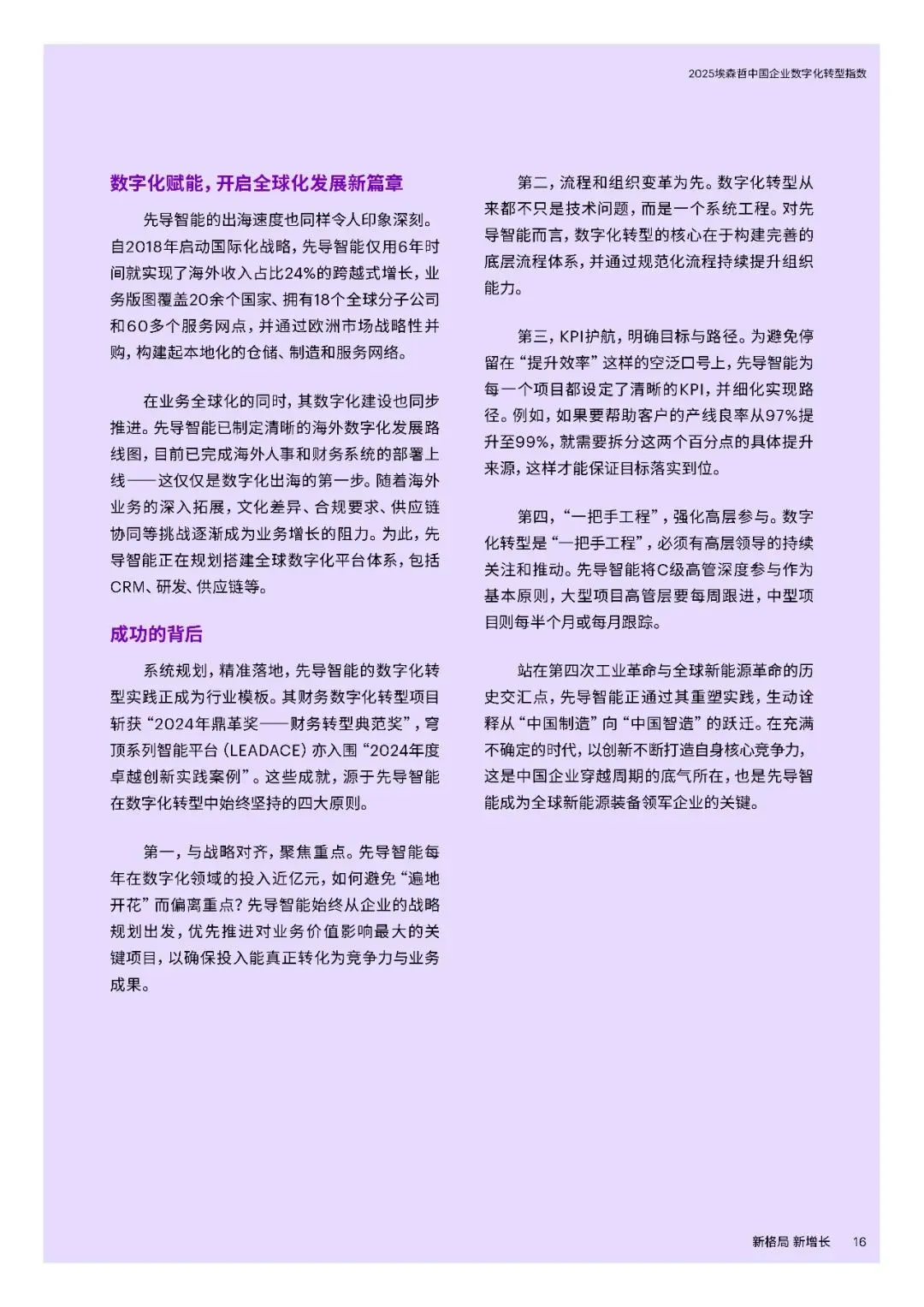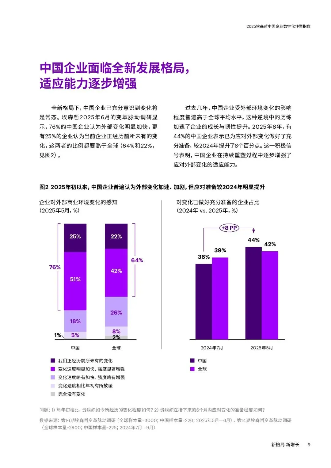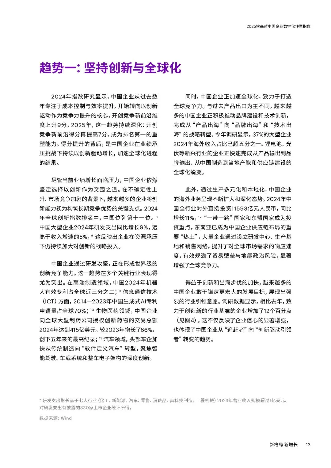 三大趋势方面,一是坚持创新与全球化。中国企业逆境中加大研发投入,2024年大型企业研发支出同比增长9%,远超收入增速。在高端制造、ICT、生物医药等领域成果显著,同时加速全球化,37%的大型企业2024年海外收入占比超五分之一,致力于从“产品出海”向“品牌与技术出海”转型。二是AI从工具走向战略。企业加速布局AI,应用场景向研发设计等复杂领域延伸,53%的中国企业通过AI连接融合多个流程。但仅9%的企业实现生成式AI显著价值转化,数字核心能力得分提升7分,云与安全建设进步明显,数据治理仍是短板。三是韧性升级对抗脆弱。“释放人才力量”得分上升4分,但组织系统性变革滞后,仅34%的企业重新设计组织架构适应AI。“优化运营”得分下降4分,静态韧性特征明显,供应链可视化和跨部门协同不足,出海企业供应链与合规能力薄弱。