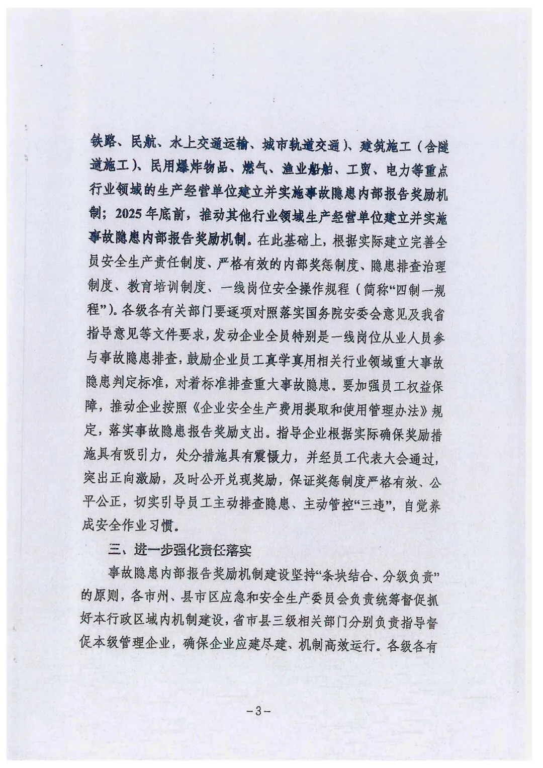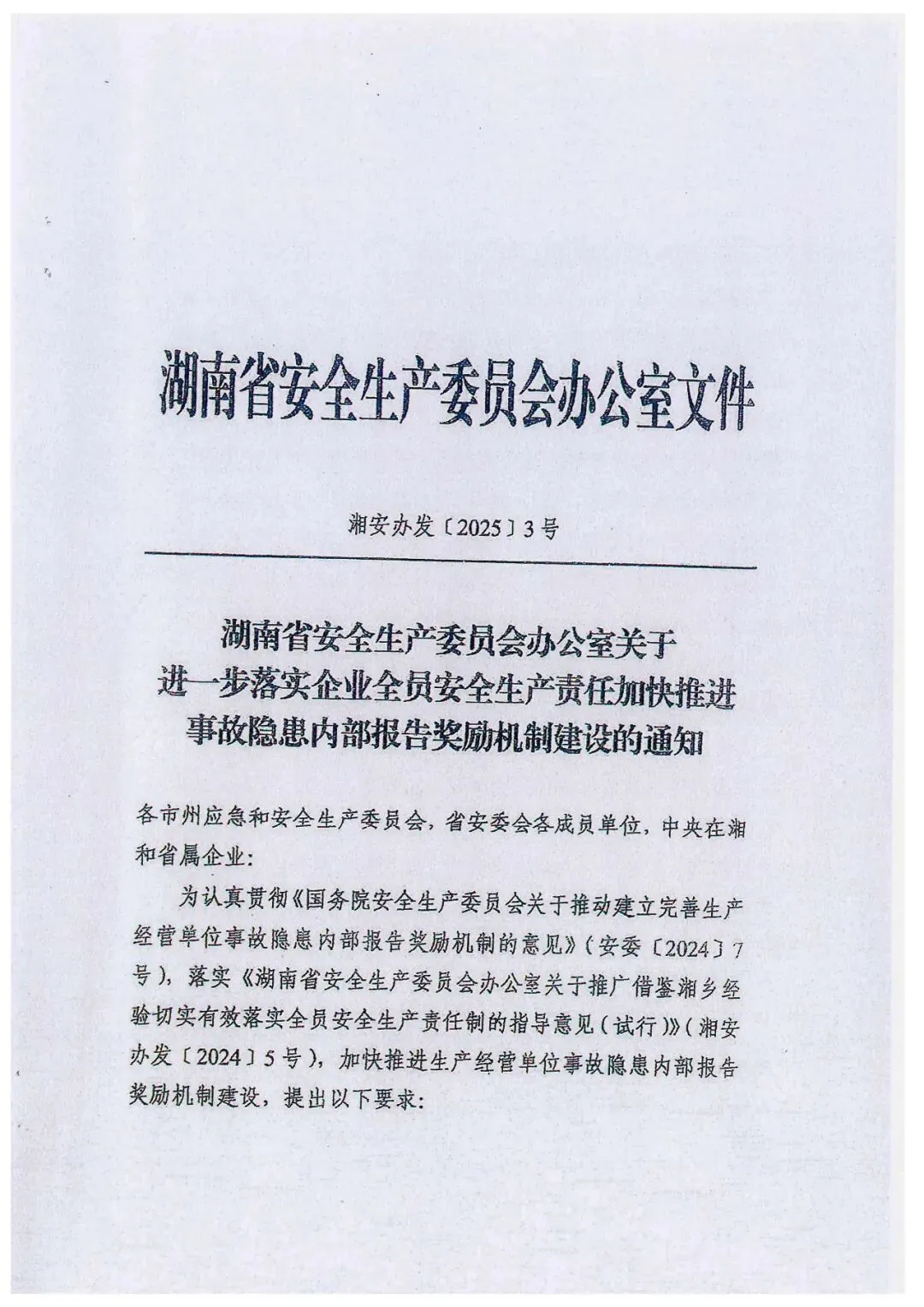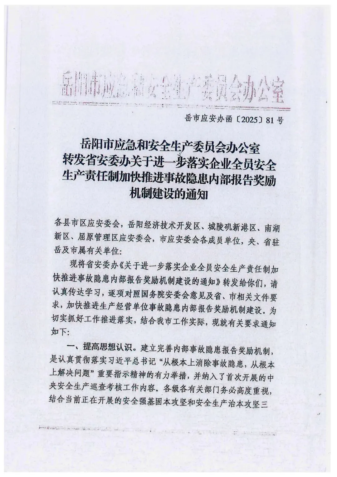 关于进一步落实企业全员安全生产责任制加快推进事故隐患内部报告奖励机制建设的通知