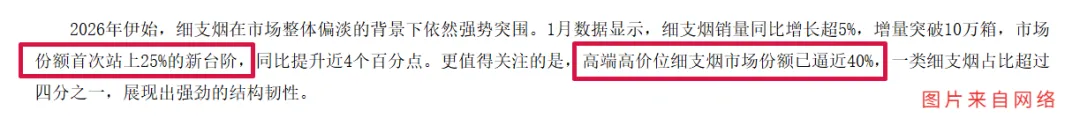 2026年刚开始细支烟市场份额突破25%,低焦产品占比持续提升,产品结构不断优化,对冲了销量小幅波动的影响。