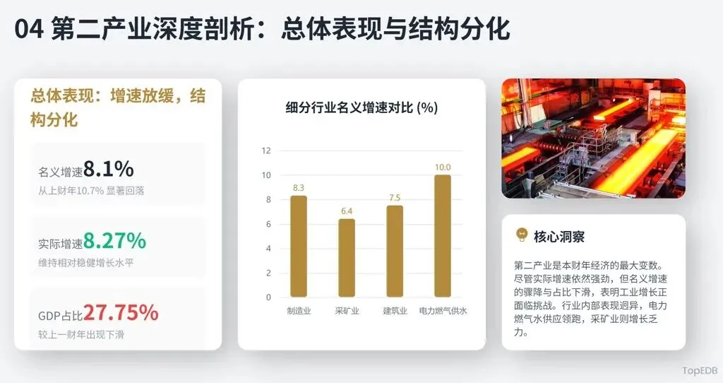 2024-25财年,分三次产业实际增速来看,第一产业增长4.18%,两年平均增长3.40%;第二产业增长8.27%,两年平均增长9.56%;第三产业增长7.87%,两年平均增长7.45%。