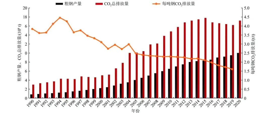 图11990—2020年我国钢铁行业CO2排放及排放强度变化