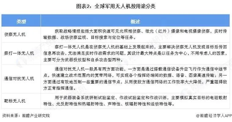 军用无人机是由遥控设备或自备程序控制操纵的不载人飞机。军用无人机具有结构精巧、隐蔽性强、使用方便、造价低廉和性能机动灵活等特点,主要用于战场侦察,电子干扰,携带集束炸弹、制导导弹等武器执行攻击性任务,以及用作空中通信中继平台、核试验取样机、核爆炸及核辐射侦察机等。军用无人机按主要用途大致可分为侦察无人机、察打一体无人机、通信对抗无人机、靶标无人机。