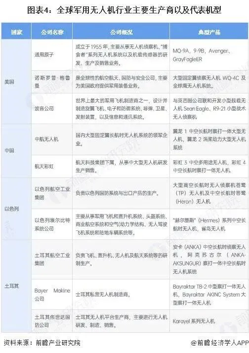 目前全球军用无人机主要生产商包括通用原子、诺斯普洛·格鲁曼、波音公司、中航无人机、航天彩虹、以色列航空工业集团、以色列埃尔比特系统公司、土耳其航空工业集团、Bayer Makina公司、土耳其伟世达国防公司等,具体如下表所示: