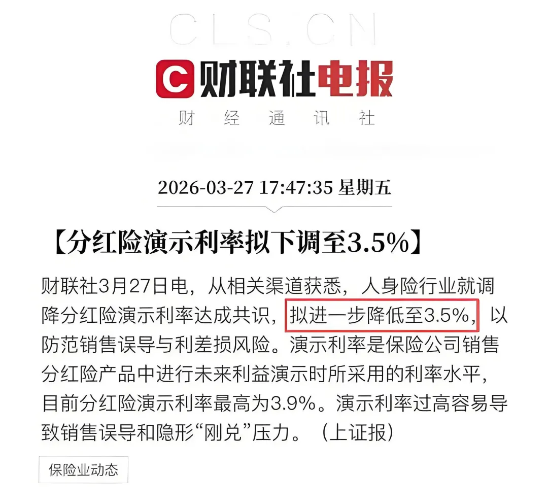 分红险演示利率上限从3.9%降至3.5%,监管指导实际分红中枢3.2%,所有超演示产品需在6月30日前完成整改或停售。这意味着,以后买分红险,不会再被“高收益”噱头误导,产品更稳健,贴合家庭长期财富规划需求,避免盲目跟风投保。