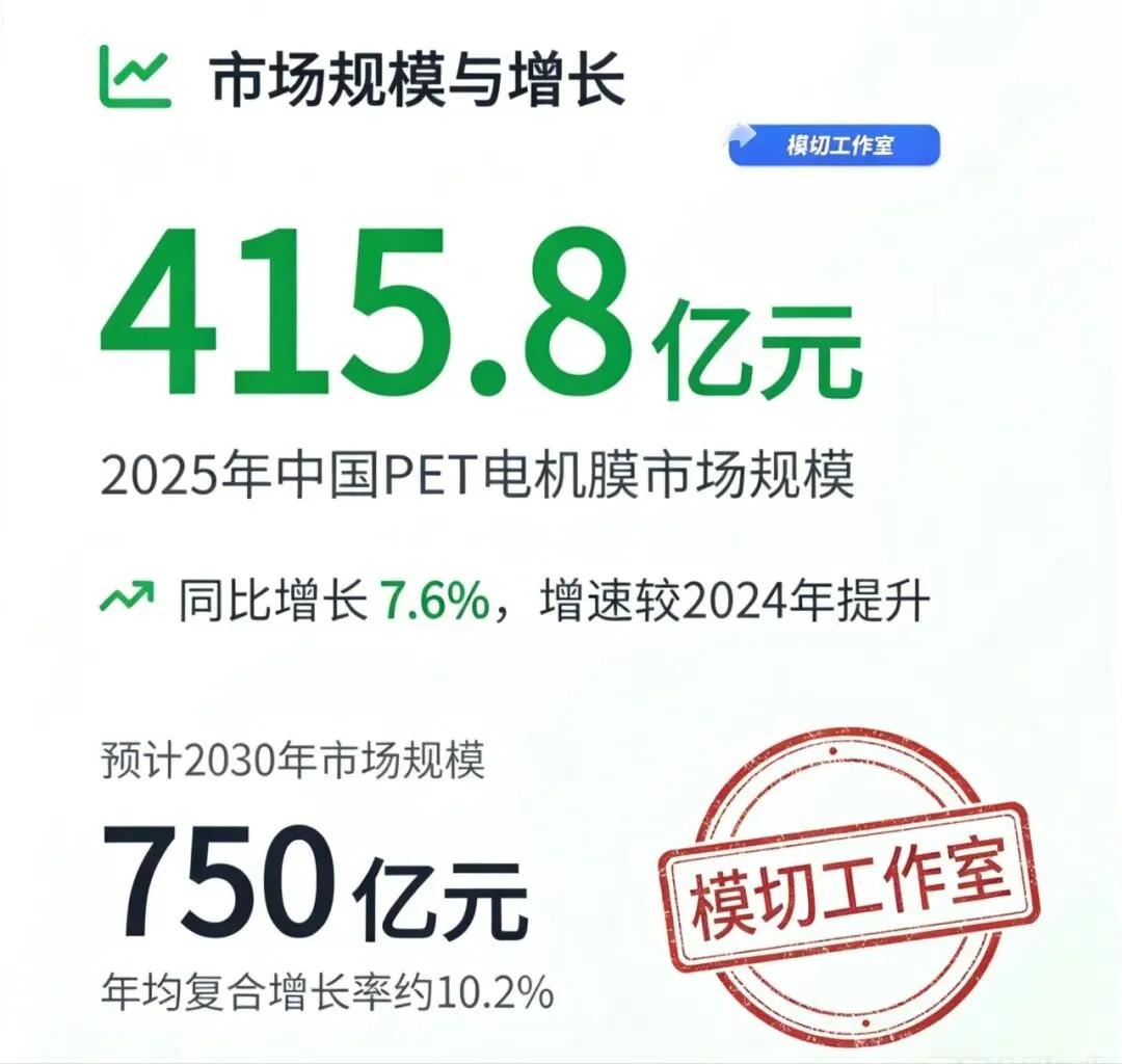 中国PET电机膜市场在2023-2026年间呈现强劲增长态势。根据最新市场数据,2023年中国PET膜市场规模达到300-350亿元,其中工业用厚膜(≥250μm)市场规模约28亿元 。2024年市场规模突破380亿元,同比增长约12% 。进入2025年,市场增长进一步加速,国内市场总规模达到415.8亿元,同比增长7.6%,增速较2024年的6.2%明显回升 。