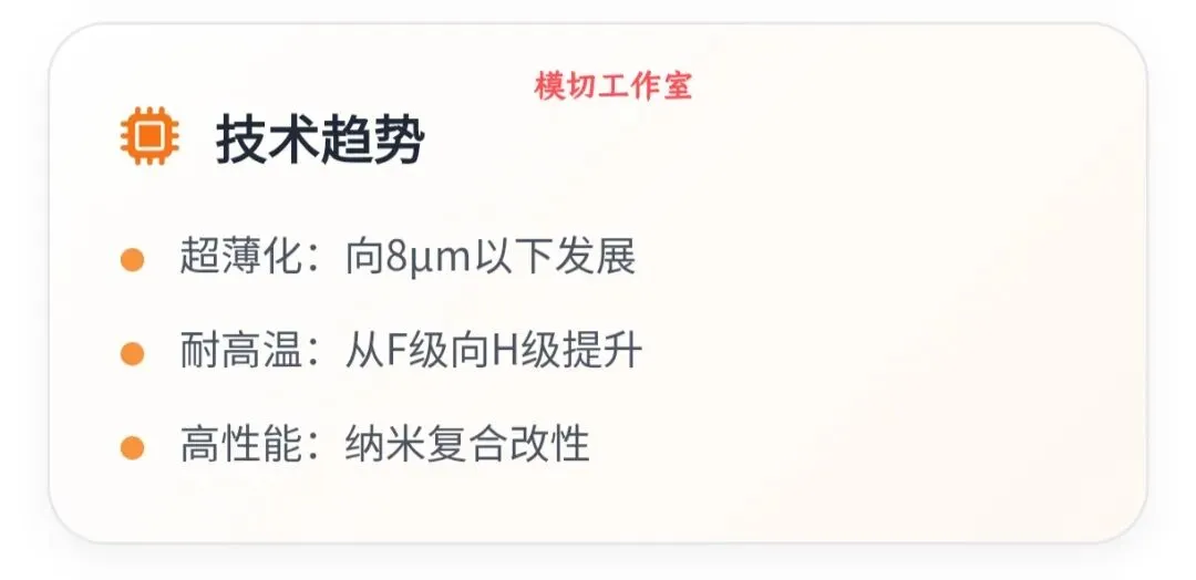 5.1 从技术发展趋势看,PET电机膜将朝着更薄、更耐高温、更高性能的方向发展。8μm以下超薄产品将成为市场主流,产品耐热等级将普遍达到H级(180℃)以上,部分高端产品将突破200℃。同时,通过纳米复合、表面改性、多层复合等技术创新,产品的综合性能将得到全面提升,以满足新能源汽车800V高压平台、工业电机IE5超高效标准、智能家电高功率密度等应用需求。