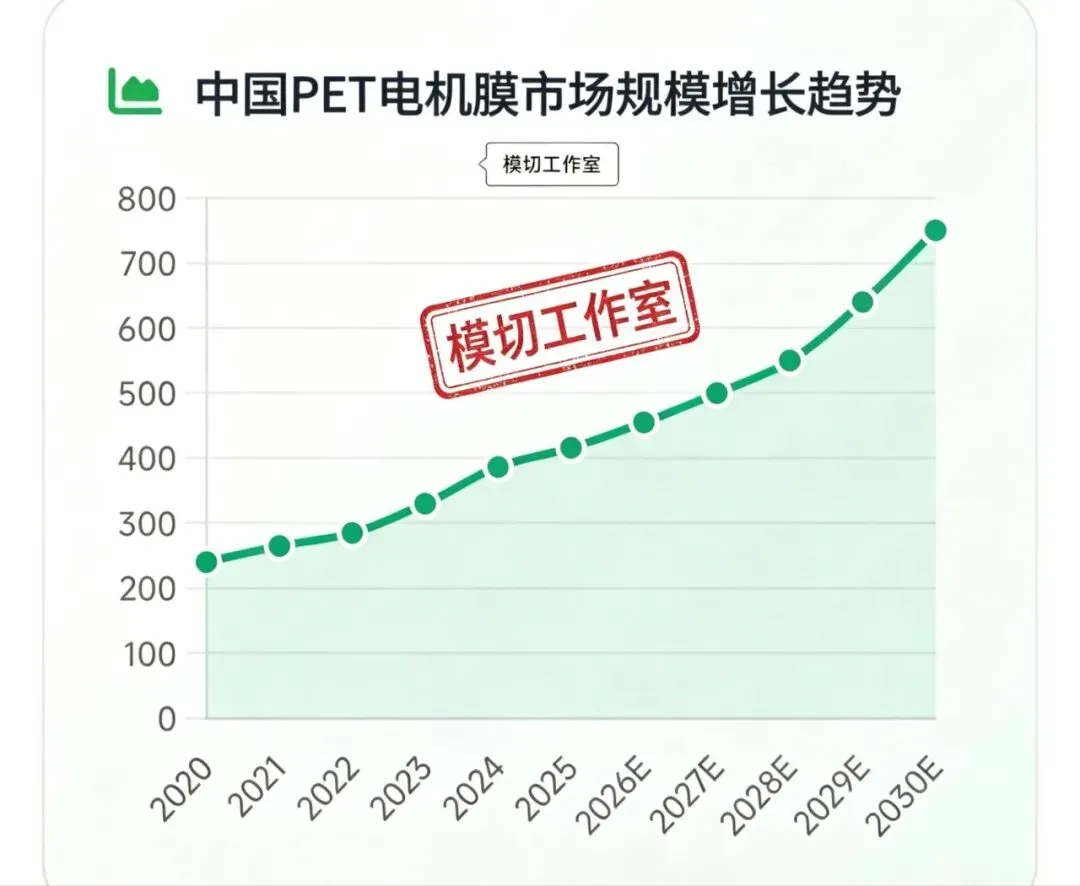 中国PET电机膜市场在2023-2026年间展现出强劲的发展势头,市场规模从2023年的300-350亿元增长至2025年的415.8亿元,年均复合增长率超过10%。展望未来,在新能源汽车产业持续扩张、工业电机能效标准不断提升、家电智能化升级等多重因素推动下,市场将继续保持高速增长态势,预计2030年市场规模有望达到750亿元以上。