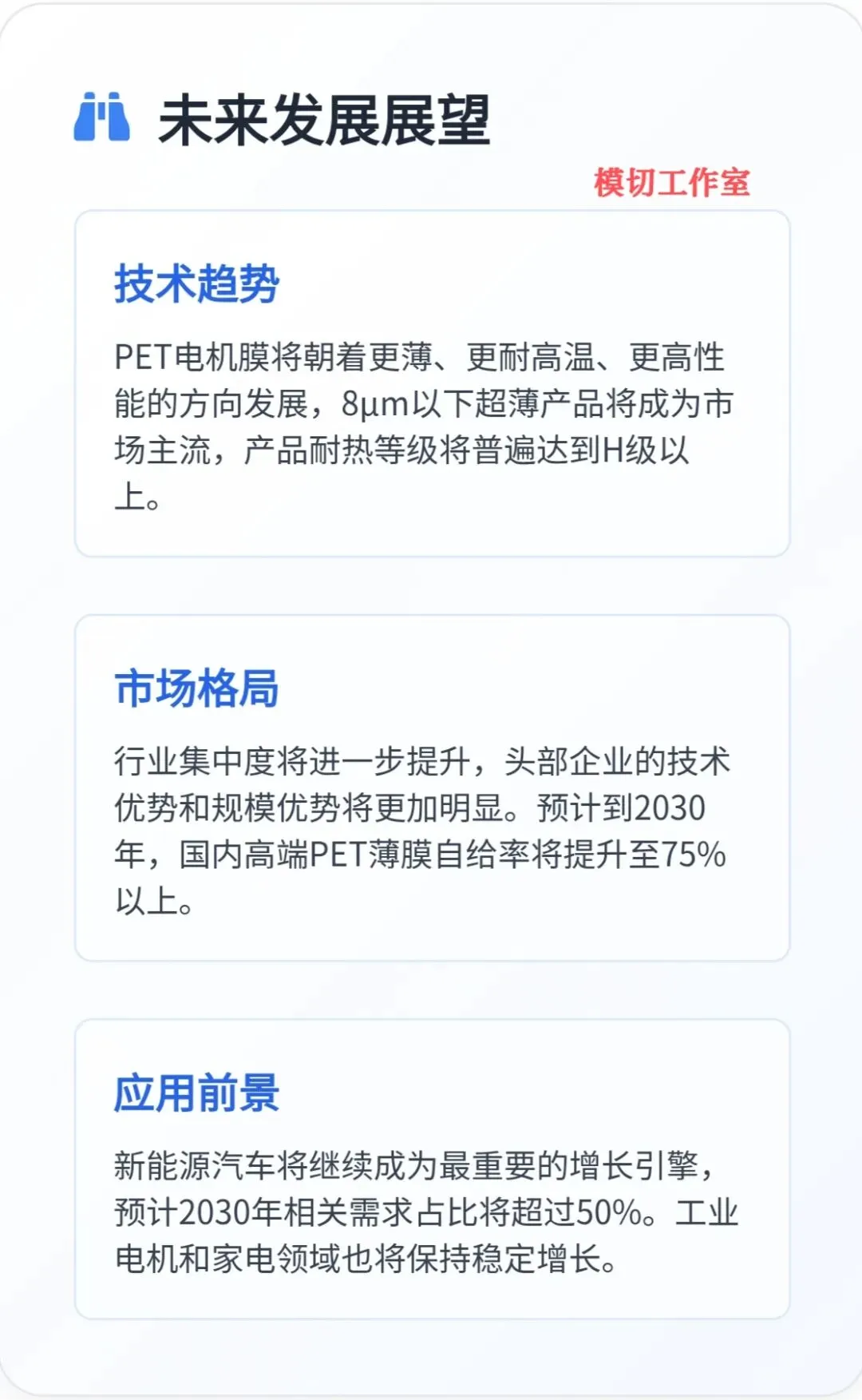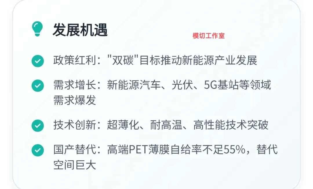 总的来说,中国PET电机膜市场正处于转型升级的关键阶段,机遇与挑战并存。只要再往前努力走一步,国产PET电机膜将彻底领跑整个全世界同行业市场。只要企业能够准确把握市场趋势,坚持创新驱动,优化产品结构,强化风险管理,就一定能够在这个充满活力和前景的巨大市场中实现新的跨越,中国企业从跟跑到并跑,从并跑到最后领跑,为中国制造业的高质量发展做出更大贡献。(模切工作室:所有的努力付出都应该让更多人看到)
