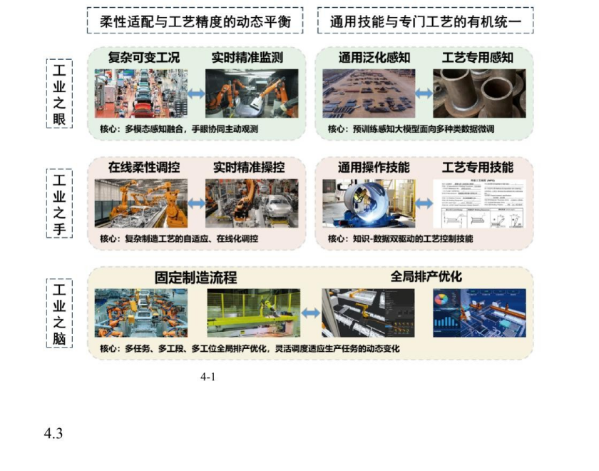 通用技能与专门工艺的有机统一:智能制造机器人既要具备跨领域的基础操作能力,如抓取、放置、装配、拧紧、轨迹跟踪、曲面随形等,又要掌握面向特定制造工艺的专家级技能。 |