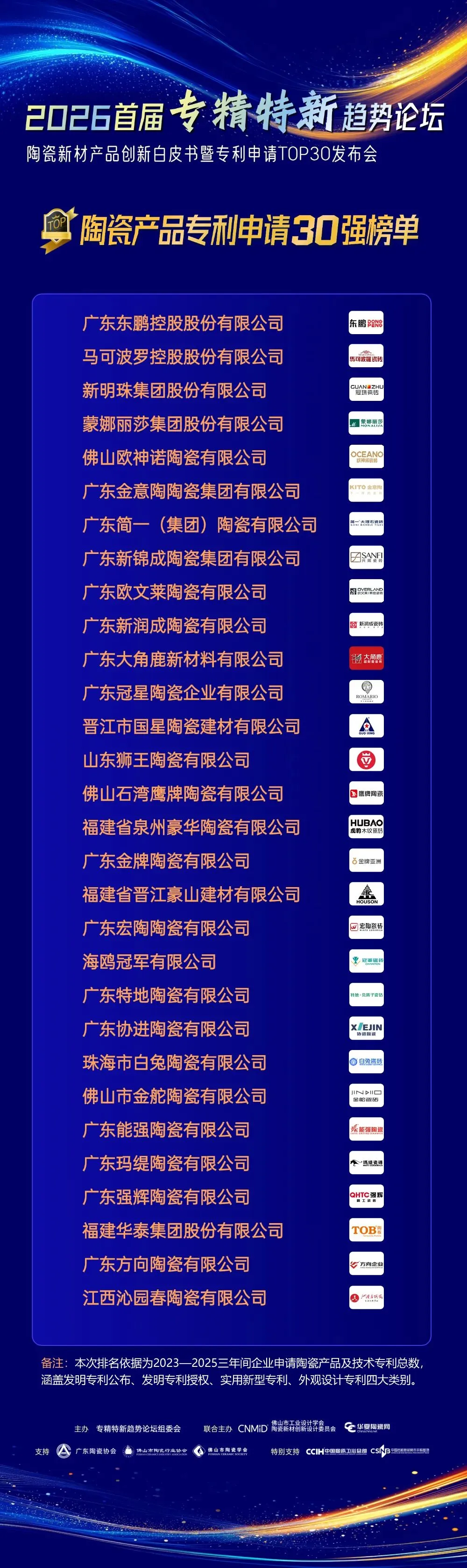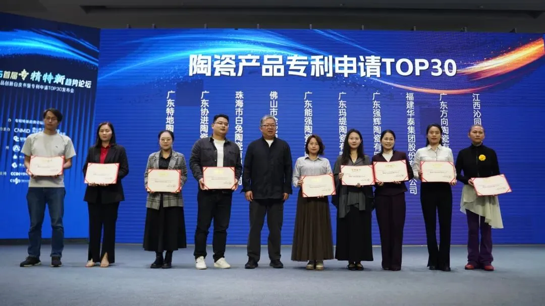 罗马利奥、国星、大角鹿、狮王、鹰牌、虎豹、金牌亚洲、豪山、宏陶、冠军、特地、协进、白兔、金舵、能强、玛缇、强辉、华泰、方向、沁园春的20家企业分两批次获得“陶瓷产品专利申请TOP30”奖项。