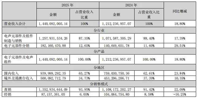 报告期内,公司持续聚焦精密电声元器件、零组件业务、半导体封测业务、汽车电子业务,进一步提升公司盈利能力和企业规模。报告期内,公司实现营业收入 1,440,092,005.14 元,同比增长 18.80%;实现归属于上市公司股东的净利润 74,209,165.03 元,同比增长 0.79%,基本每股收益 0.2060 元。报告期内,汽车及工业应用实现营业收入724,373,057.18 元,占总营业收入的 50.30%,同比增长 18.25%;消费电子实现营业收入 715,718,947.96 元,占总营业收入的 49.70%,同比增长 19.36%。