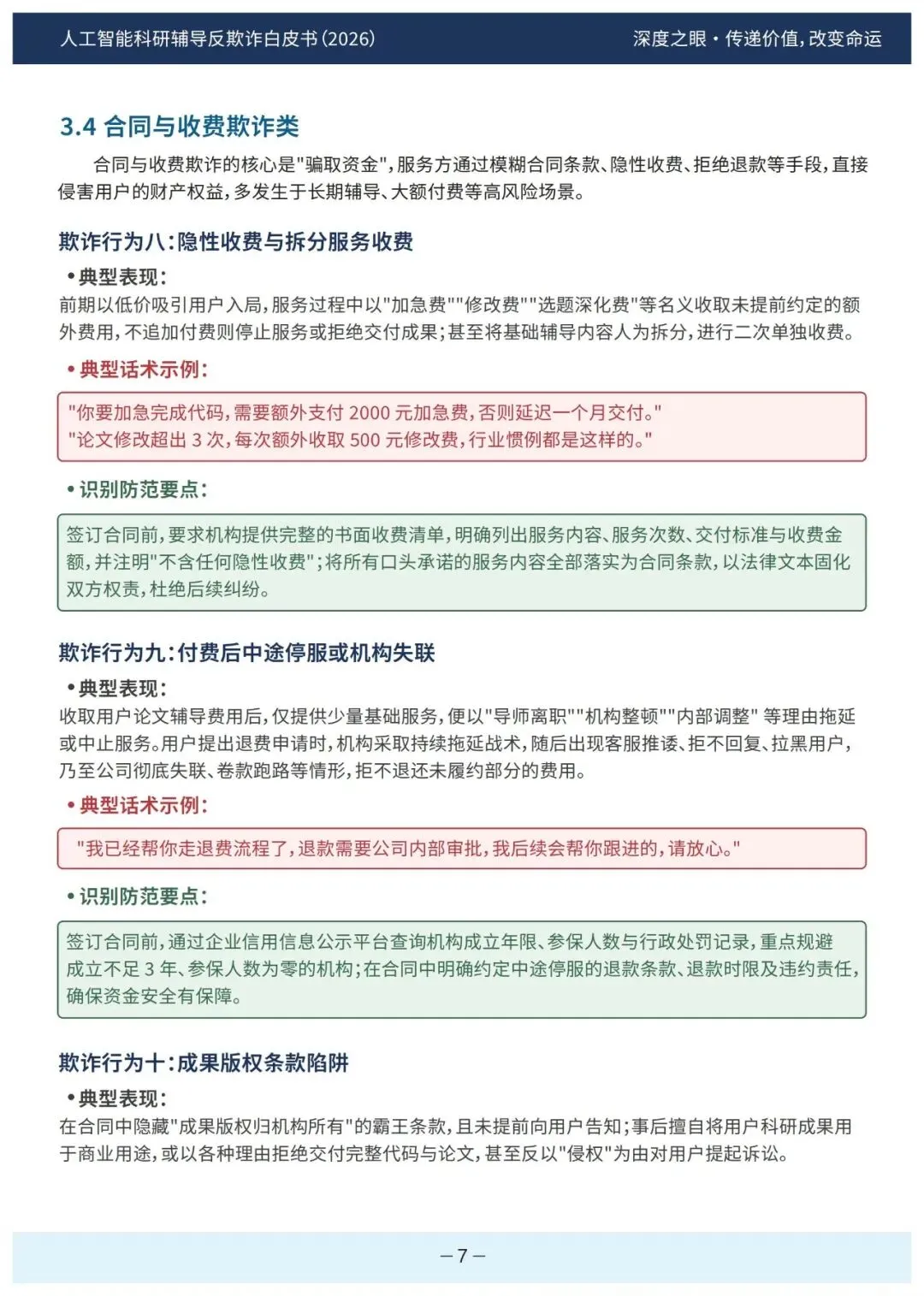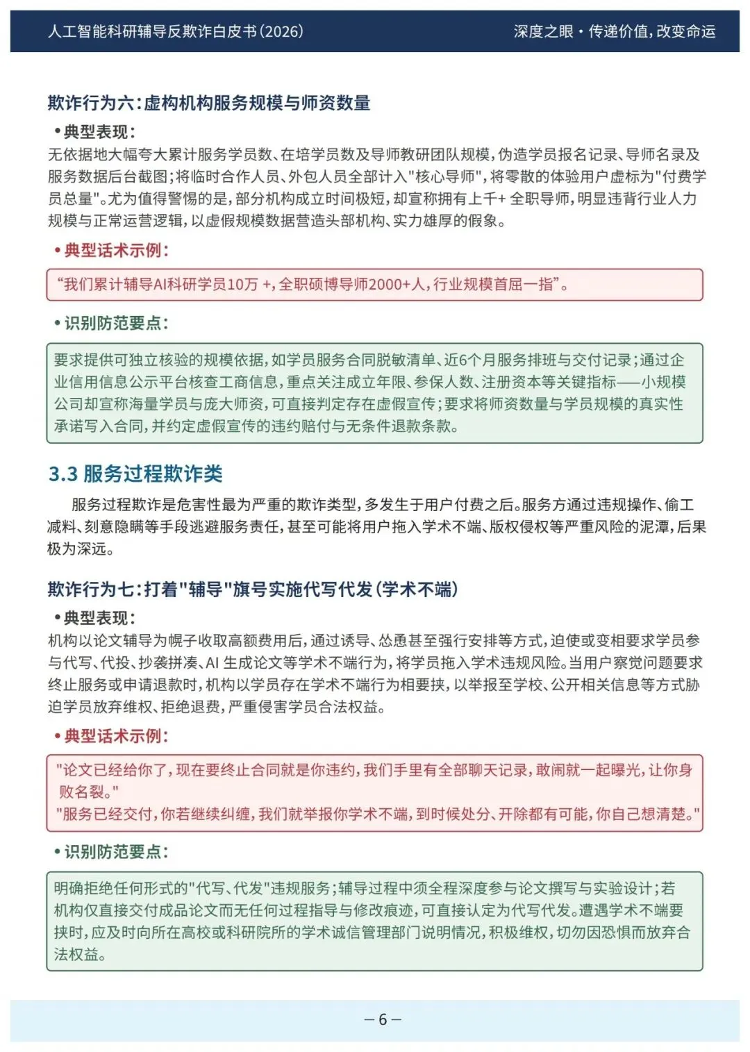 防范要点为核查工商信息、要求提供合作原件、独立核验授权。服务过程欺诈类以“辅导”为名实施代写代发,诱导学员参与学术不端,事后以举报相要挟阻止用户维权。防范要点是拒绝代写、全程深度参与、留存过程记录。