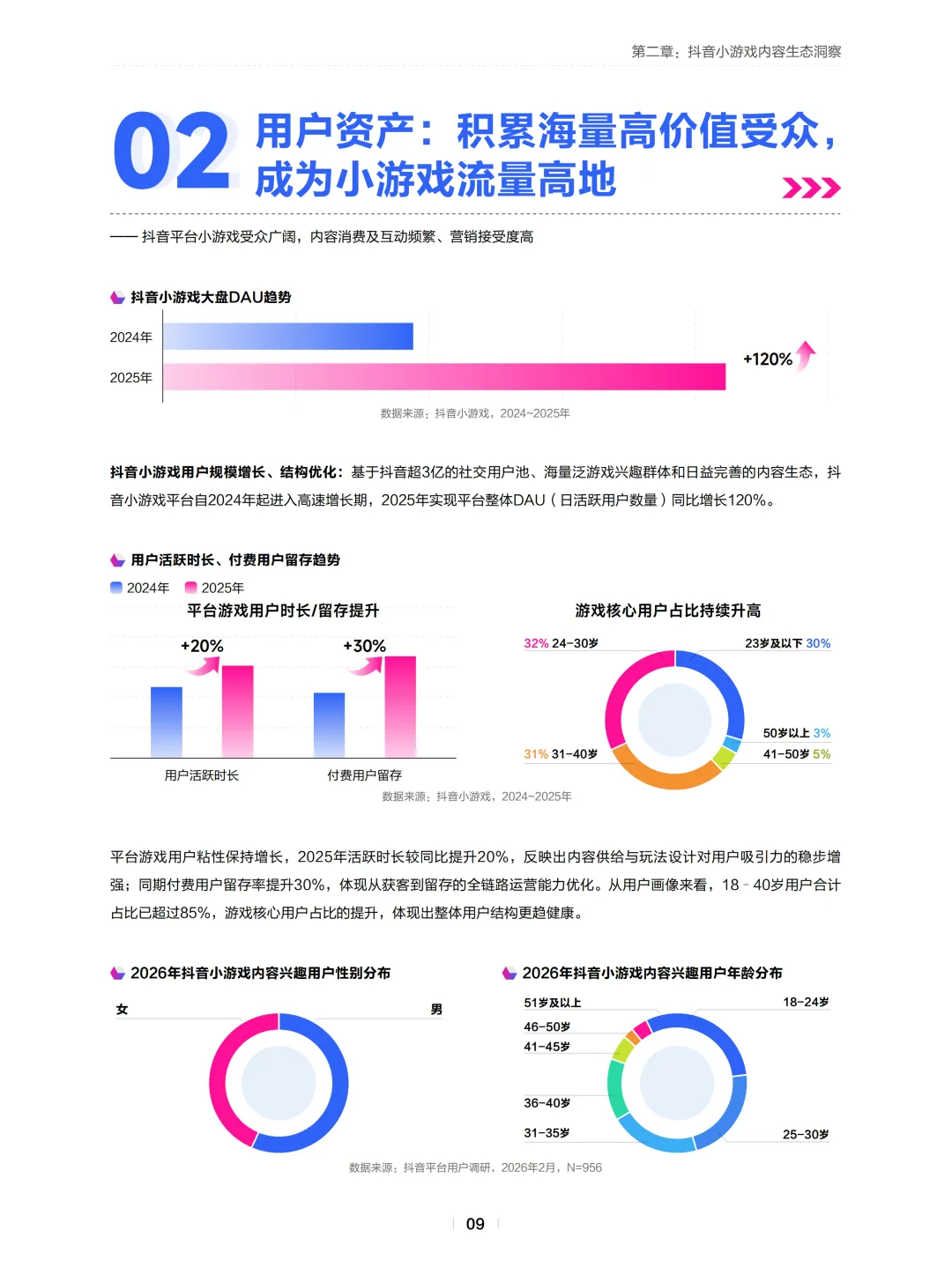2026年抖音小游戏行业白皮书显示,行业已迈入千亿级上升周期。抖音小游戏以近30%的市场份额领跑,DAU同比增长120%,生态从流量快消转向精品化、长线化、全域经营,成为手游IP新增量与开发者核心阵地。
