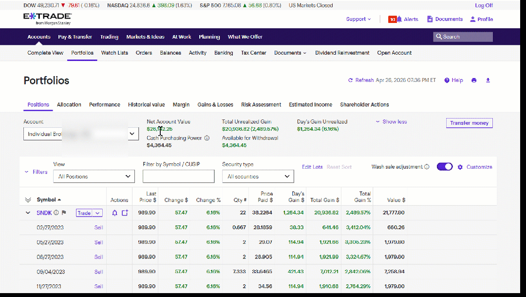 另外,SNDK周四财报,我们SNDK已经盈利 2489%,考虑是否财报前卖出。仓位成本38美元,现在989美元,之前我们已经出了一半仓位