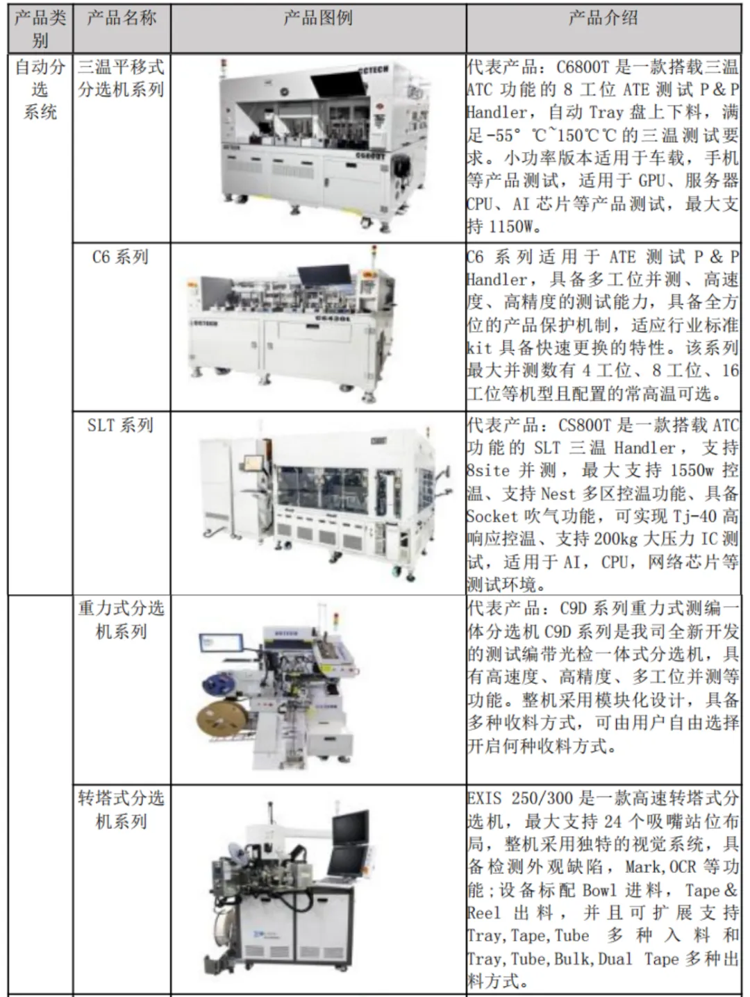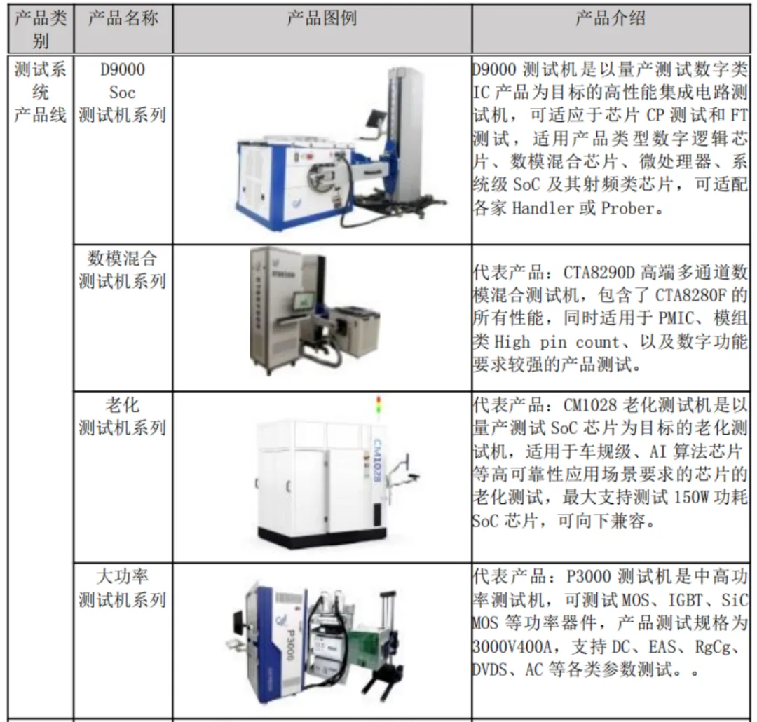 公司于2023年通过发行股份购买资产方式完成了对长奕科技(即马来西亚Exis)的收购。Exis专注于转塔式分选机的研发、生产和销售,在该细分领域积累了深厚经验。此次交易使公司实现了重力式分选机、平移式分选机和转塔式分选机的产品线全覆盖。通过销售渠道与研发技术的深度协同,公司盈利能力和可持续发展能力得到进一步提升。1)测试机:大功率测试机、模拟测试机、数字测试机等;2)分选机:重力式分选机、平移式分选机、测编一体机;3)AOI光学检测设备:晶圆光学外观检测设备、电路封装光学外观检测设备等。免责声明:信息来源于网络信息,公司官网、公司年报等,仅供免费交流,侵权立删。