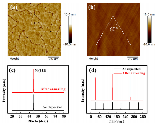 纳米真空互联实验站C类合作课题用户,国防科技大学彭俊平课题组在ɑ-Al2O3 (0001) 衬底上成功制备了平整洁净的外延晶圆级单晶Ni (111) 薄膜,为解决Ni薄膜中晶界和双晶结构,从而获得大尺寸均匀石墨烯扫除障碍。该工作以“Wafer-scale epitaxial single-crystalline Ni (111) films on sapphires for graphene growth”为题发表在JOURNAL OF ELECTRONIC MATERIALS期刊上。