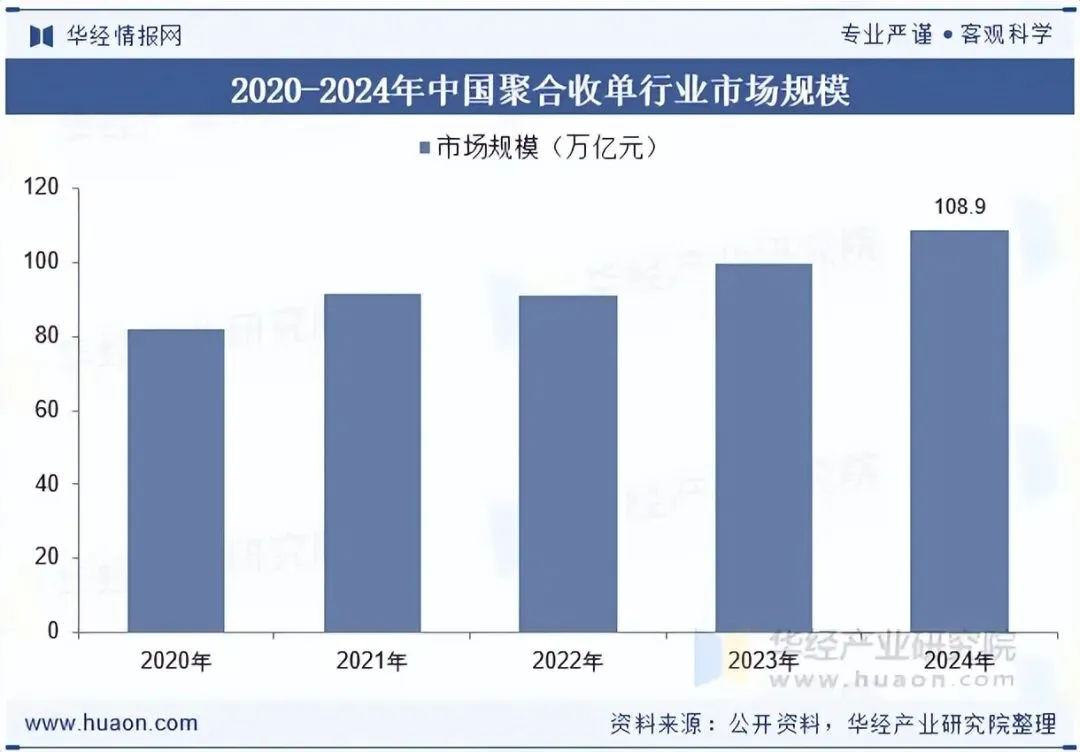 随着线下消费场景的全面复苏、中小微商户数字化转型的加速渗透,以及“支付+增值服务”模式对商户需求的深度适配,2024年中国聚合收单行业市场规模达到108.9万亿元,同比保持稳健增长态势,延续了近年来的扩张势头。从场景分布来看,零售、餐饮等传统高频场景贡献核心增量,而交通出行、政务缴费、医疗健康等新兴场景的拓展进一步打开市场空间。