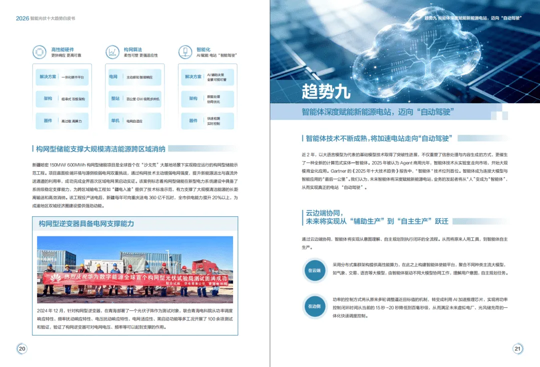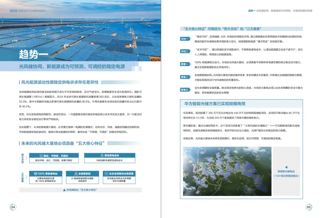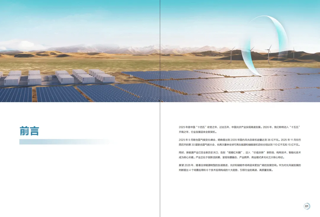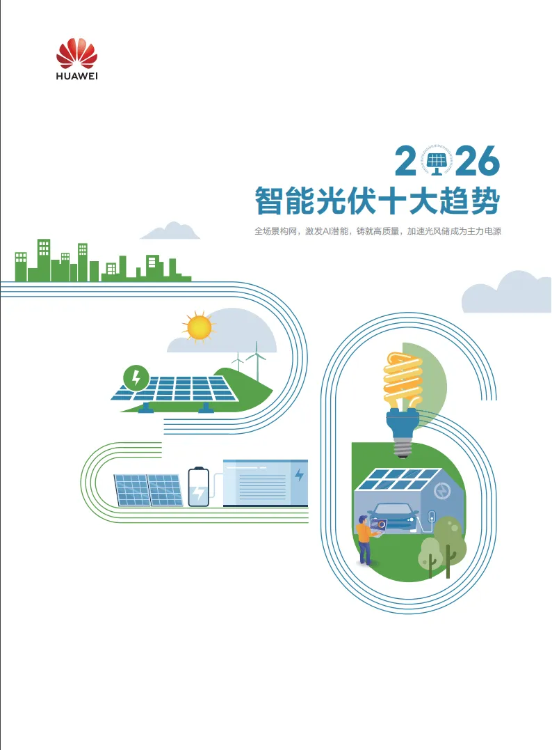 2026年全球能源转型加速,光伏与储能产业告别规模红利期,迈入价值深耕新阶段,构网技术与智能化成为核心驱动力,呈现场景融合、产业跨界、商业模式多元化特征。华为基于行业发展态势,提出由4个场景应用、6个技术应用构成的智能光伏十大趋势,推动光风储成为主力电源,助力新型电力系统构建。