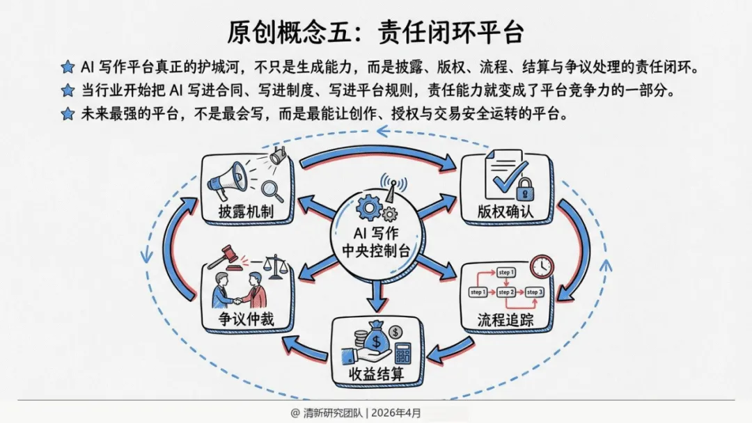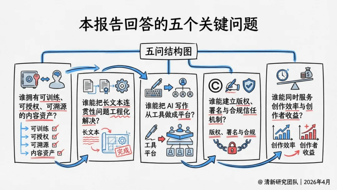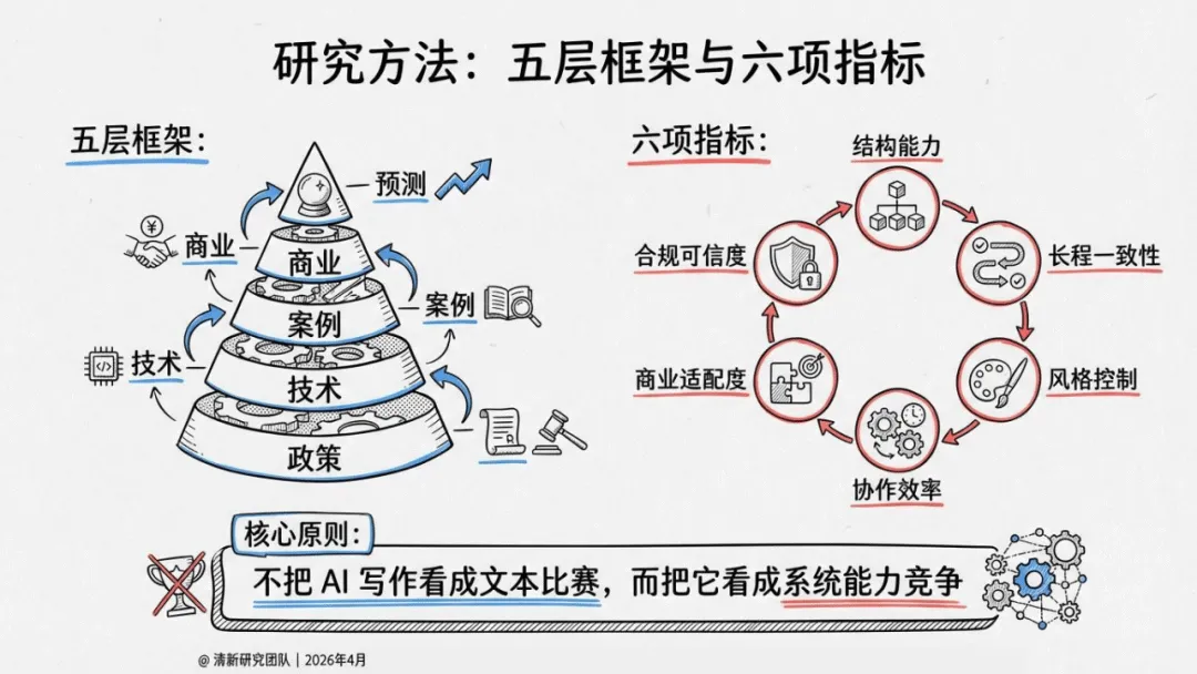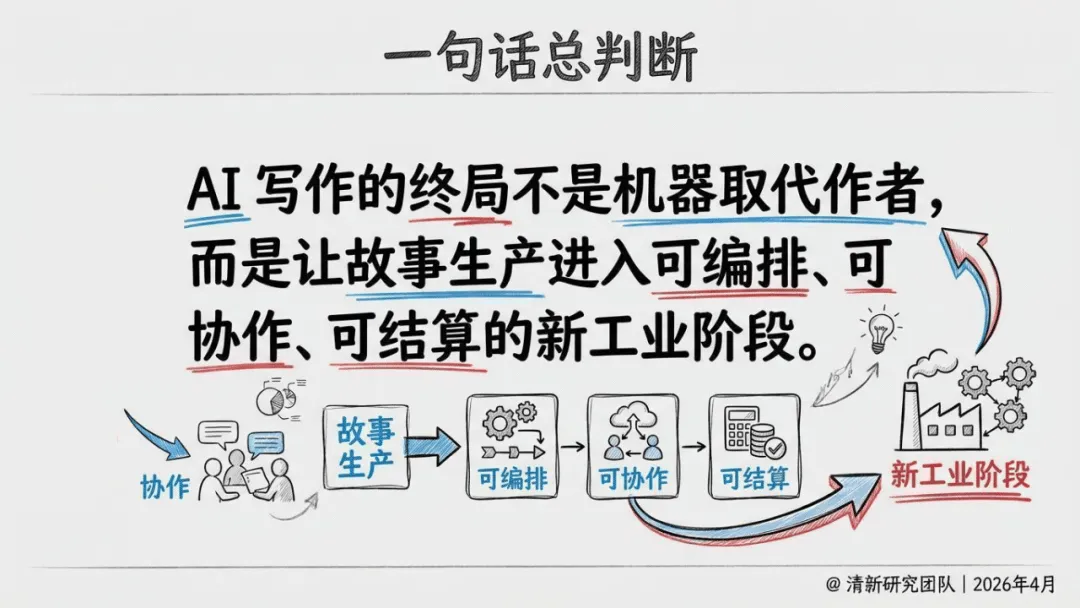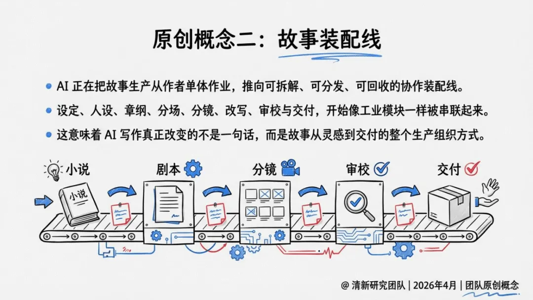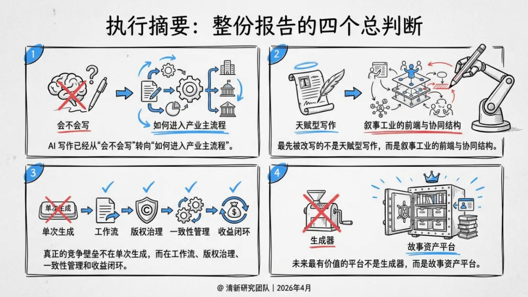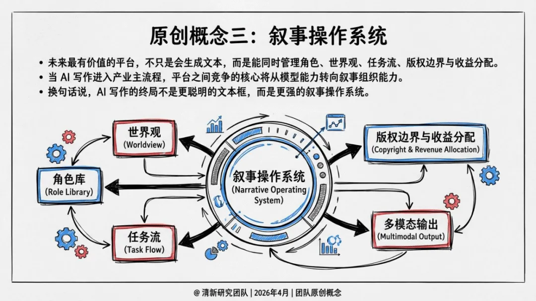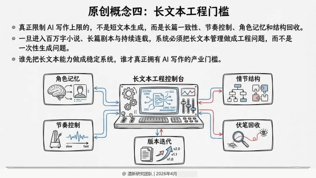 报告提出五大原创概念,精准界定AI写作的产业价值:前九稿红利聚焦前期试错与结构验证效率提升;故事装配线将创作拆解为模块化协作流程;叙事操作系统以角色、世界观与版权管理为核心竞争力;长文本工程门槛强调长篇一致性、角色记忆是核心壁垒;责任闭环平台则把版权、结算与争议处理视为平台护城河。