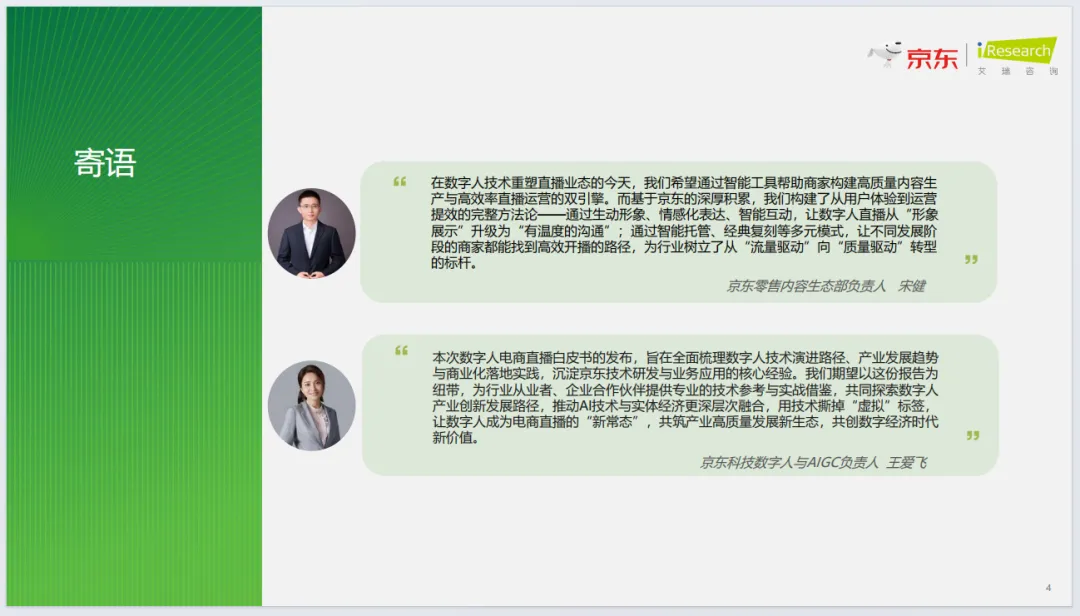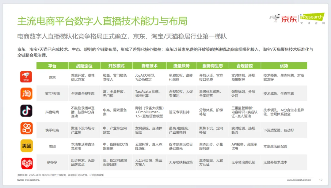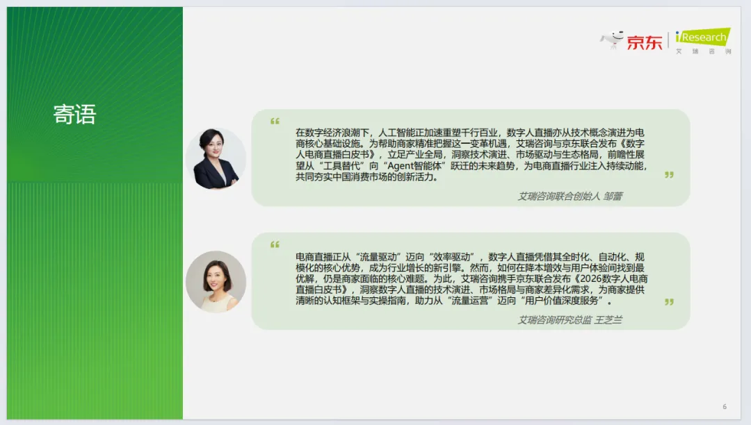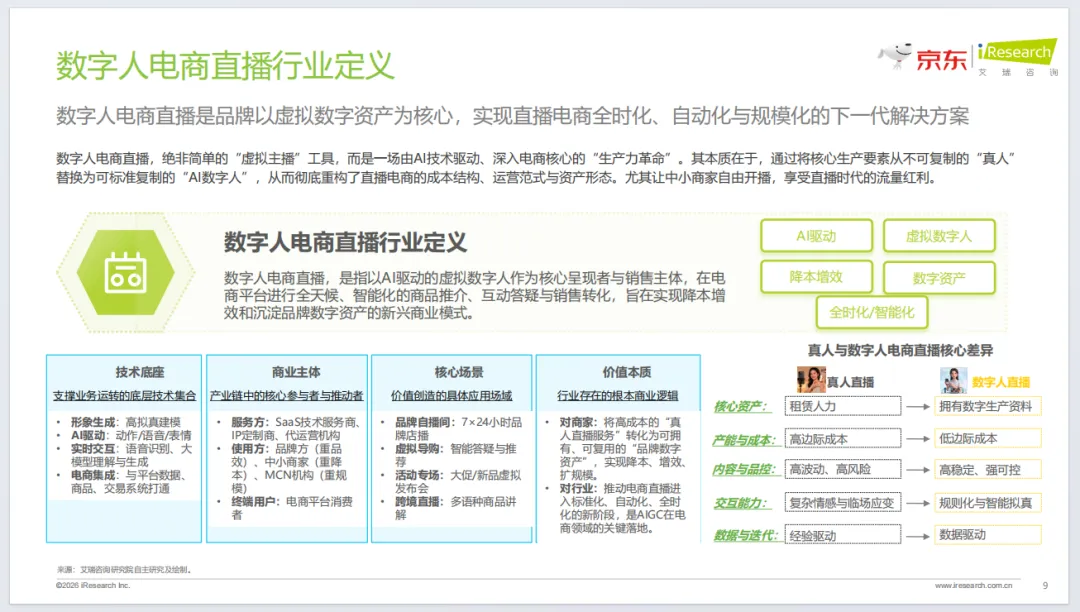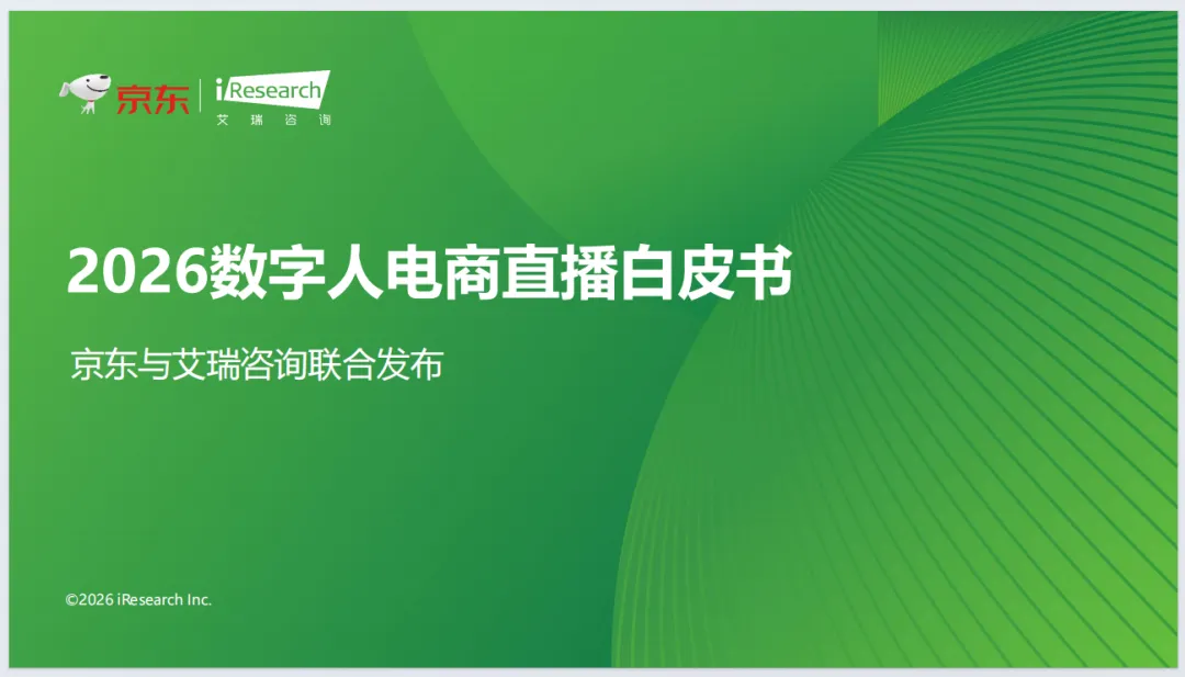 《2026数字人电商直播白皮书》由京东与艾瑞咨询联合发布,聚焦2026数字人电商直播行业,全景解析行业现状、应用、实践与趋势。报告明确数字人电商直播是AI驱动的电商新质生产力,已进入规模化商用期,政策规范、技术突破、商家降本需求共同驱动行业发展。当前行业形成梯队竞争格局,京东以普惠免费、技术自研领跑,服务商家超7万家。