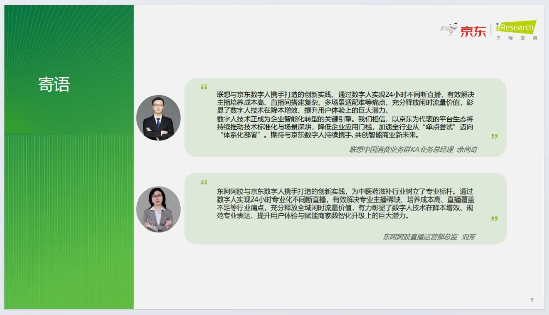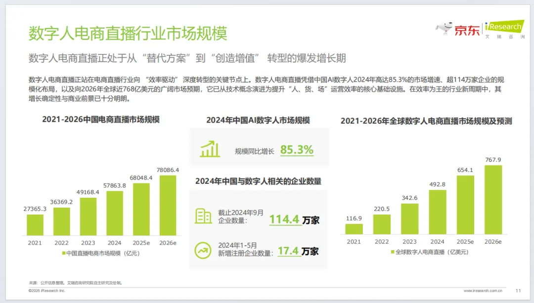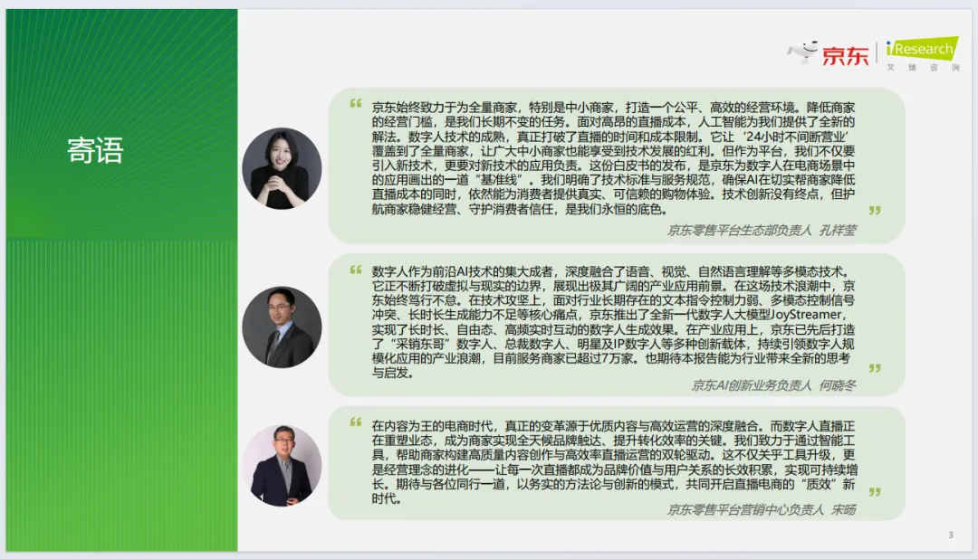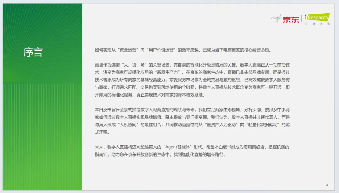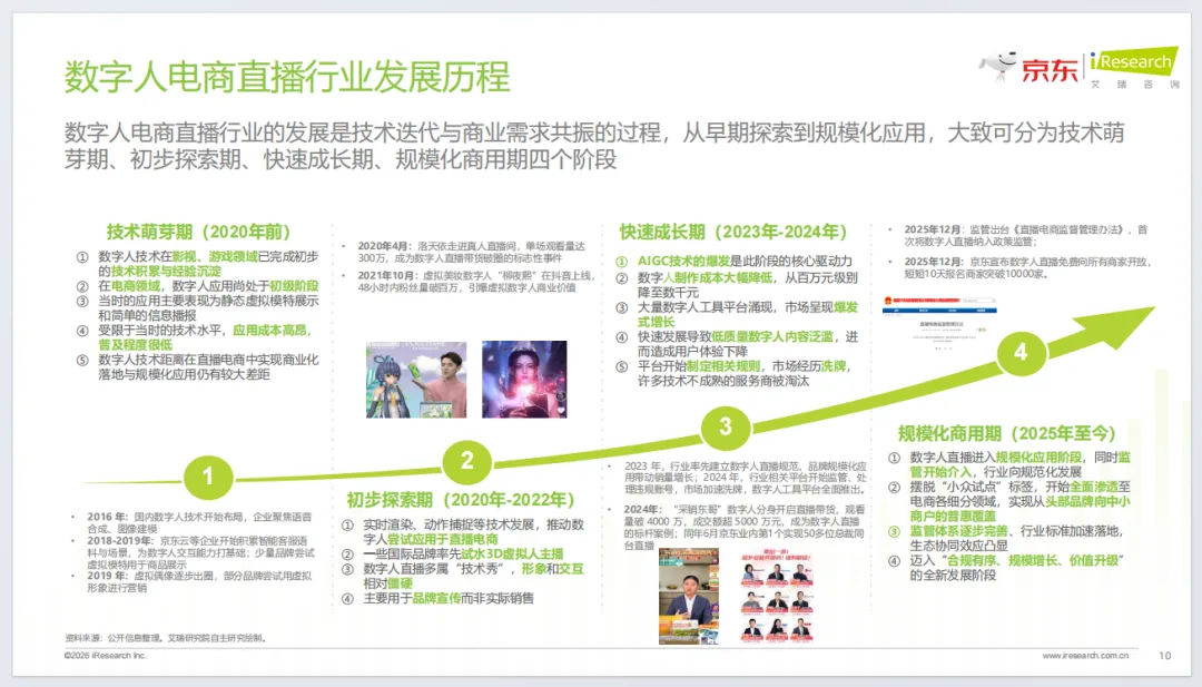 京东构建五维评估体系与全流程方法论,依托JoyStreamer大模型实现自由态数字人、情感化交互等技术突破,提供一键开播、真人复刻等模式,联动京麦服务市场打造生态闭环,落地联想、东阿阿胶等标杆案例。行业未来将迈向Agent智能体时代,实现交互个性化、能力自主化、研发前置化、生态算力化,推动电商直播从流量运营转向用户价值深度运营。