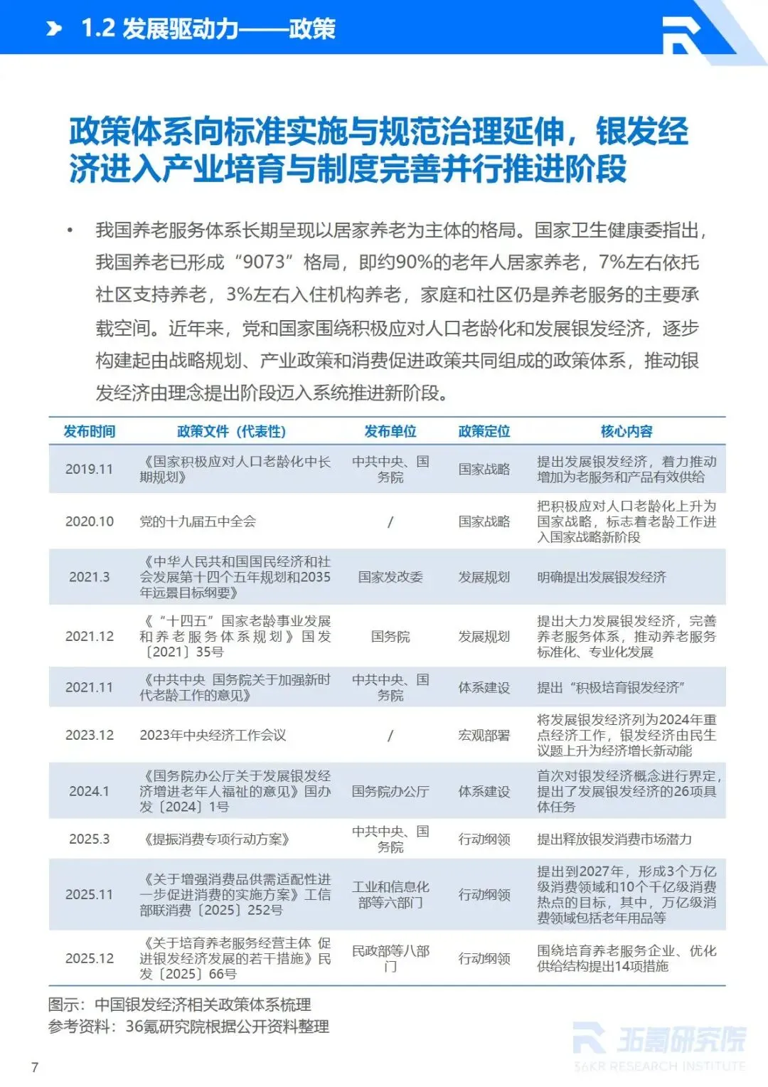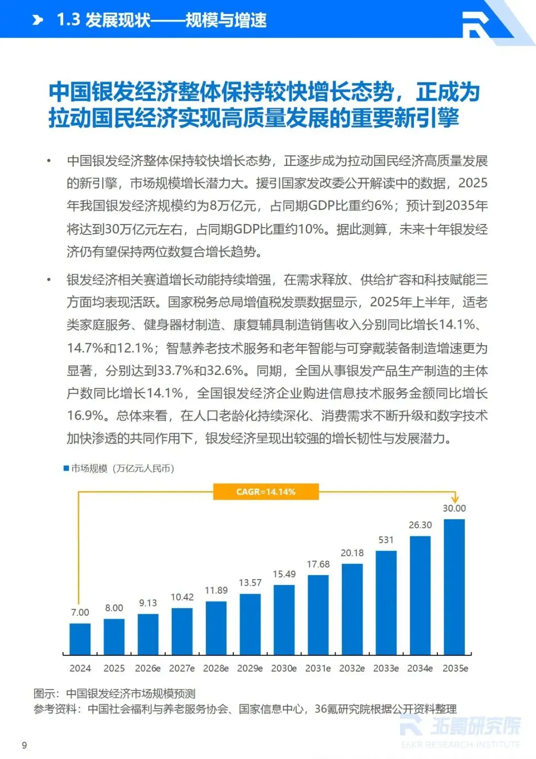 随着我国步入中度老龄化社会,银发经济已超越传统养老范畴,演变为覆盖为老与备老的综合性产业体系。在人口结构变迁、政策体系完善与市场需求升级的共同驱动下,产业正迈向品质化、生态化与社区化协同发展的新阶段。核心结论指出,银发经济规模预计到2035年将达30万亿元,其增长动能源于需求分层深化与供给能力提升的共振。