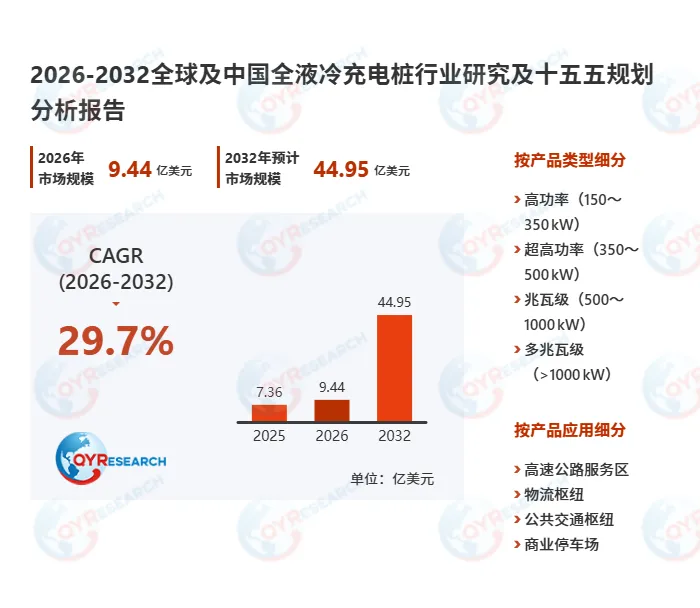 ? 据最新数据,全球全液冷充电桩市场正以年复合增长率29.7% 狂飙,从2025年的7.36亿美元,冲向2032年的44.95亿美元。