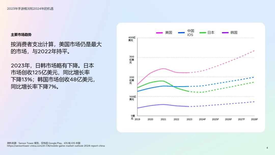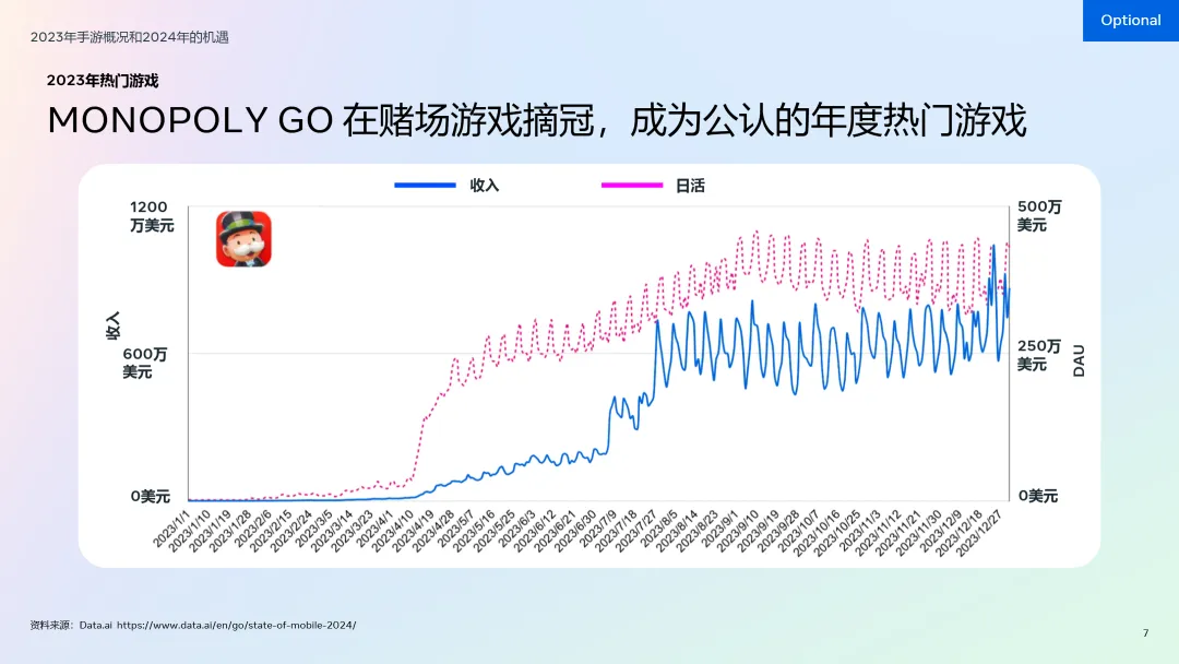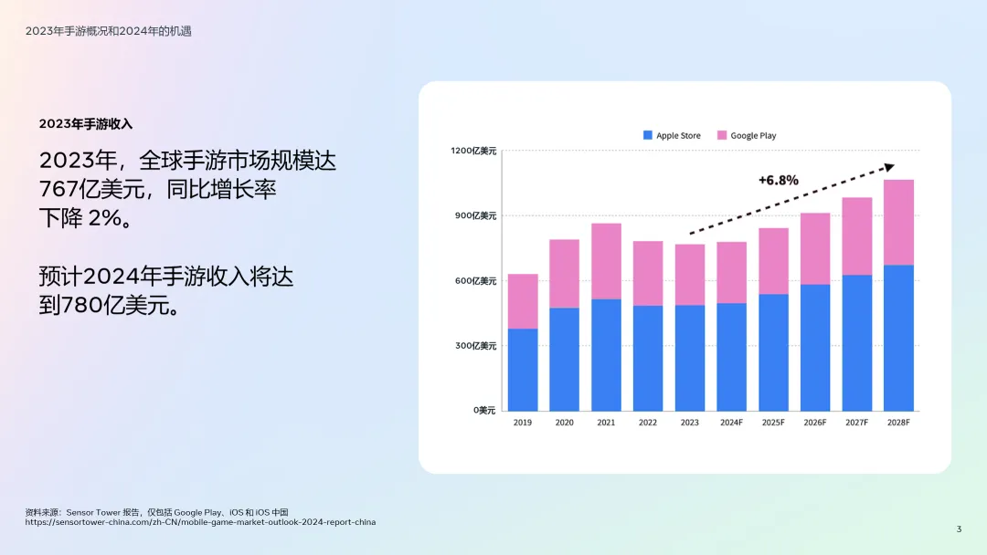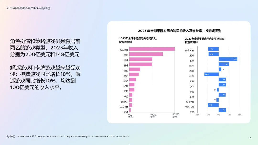 • 2023年全球手游市场规模达767亿美元,预计2024年将突破780亿美元:尽管整体增速下滑(同比下降2%),但细分品类表现亮眼,解谜和棋牌游戏收入双双突破百亿美元大关,同比分别增长10%和18%,成为增长最快的赛道。