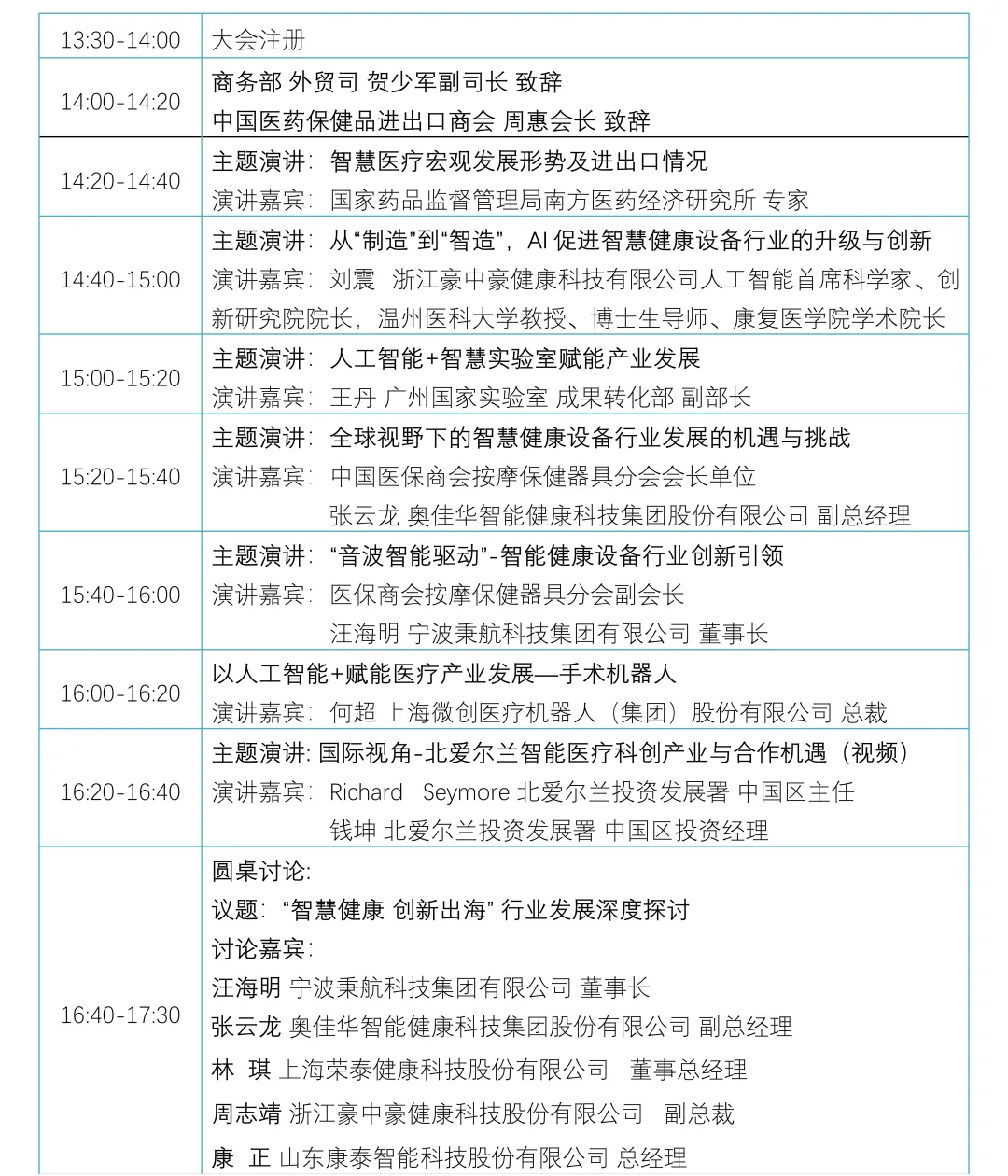 为贯彻落实国家关于“人工智能+”行动和智慧医疗发展的战略部署,推动智慧医疗健康产品产业升级与外贸高质量发展,服务全球民众智慧健康生活,我会将于5月2日下午在广交会期间召开“2026秉航・智慧医疗器械创新发展论坛暨按摩保健器具行业发展大会”。会议将围绕智慧健康设备行业发展的机遇与挑战、人工智能赋能行业发展、国际市场合作机遇、创新驱动助力跨境电商等多层次、多维度进行深度探讨、交流互鉴,共同引领产业国际市场竞争新优势。会议具体安排如下: